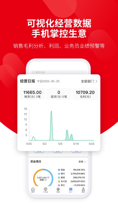 5. 资金分析包括资金余额/收入支出分析、资金趋势、账户明细/账户资金流水。