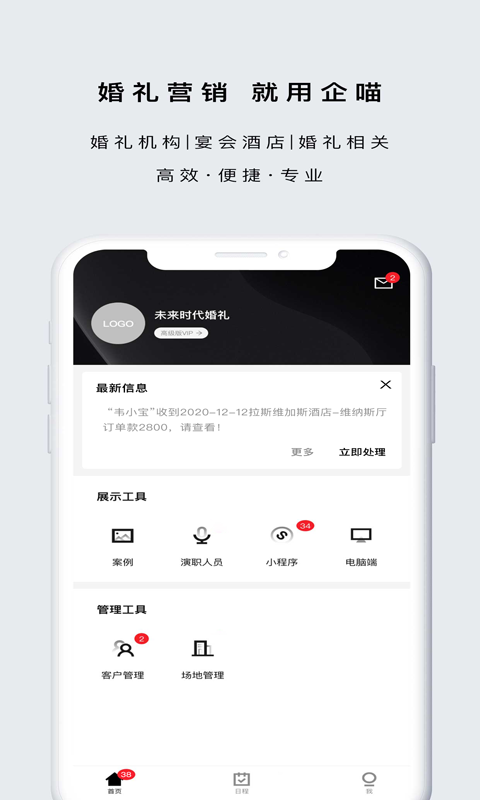 企喵是一款专门为婚嫁行业精心打造的专属营销管理系统。它具备APP、PC端以及微信小程序,能够全方位解决营销、获客、管理等一系列问题。
