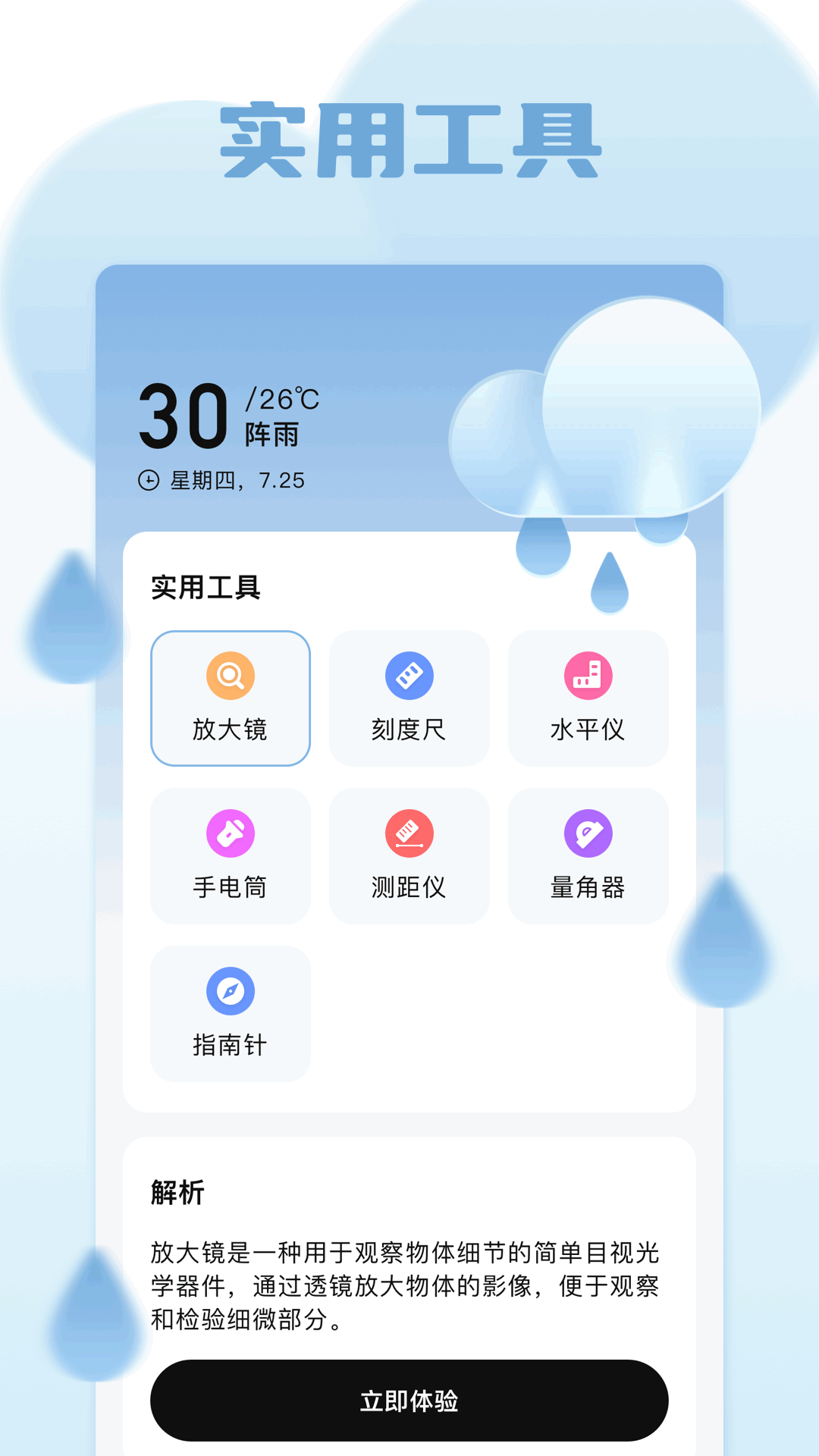 悟空工具箱提供了众多实用的工具,像放大镜、刻度尺、水平仪、手电筒、测距仪、量角器以及指南针等。同时,它还具备色调调整、涂鸦、旋转、裁剪、滤镜等功能。