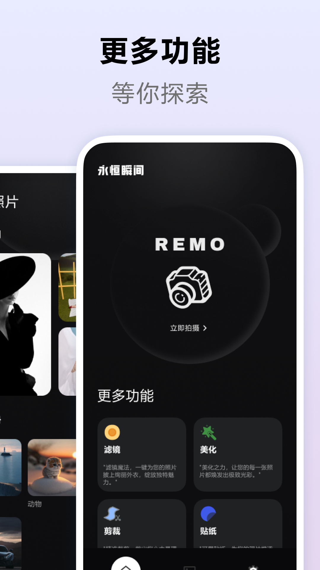 Remo是一款功能丰富的app,它配备了相机功能,能满足您随时拍照的需求。同时,它还拥有图片美化功能,让您的照片更加出众。其滤镜效果多样,可以瞬间改变照片的风格氛围;剪裁功能方便您对图片进行尺寸调整;贴纸丰富有趣,为照片增添更多创意元素;文字功能使您能在图片上添加个性文字;马赛克功能可以保护隐私或者制造特殊效果;抠图功能也十分实用。此外,Remo还包含日历等功能。这里还有更多精彩内容等待您去发现哦,快来下载Remo体验吧,我们非常期待您的反馈。