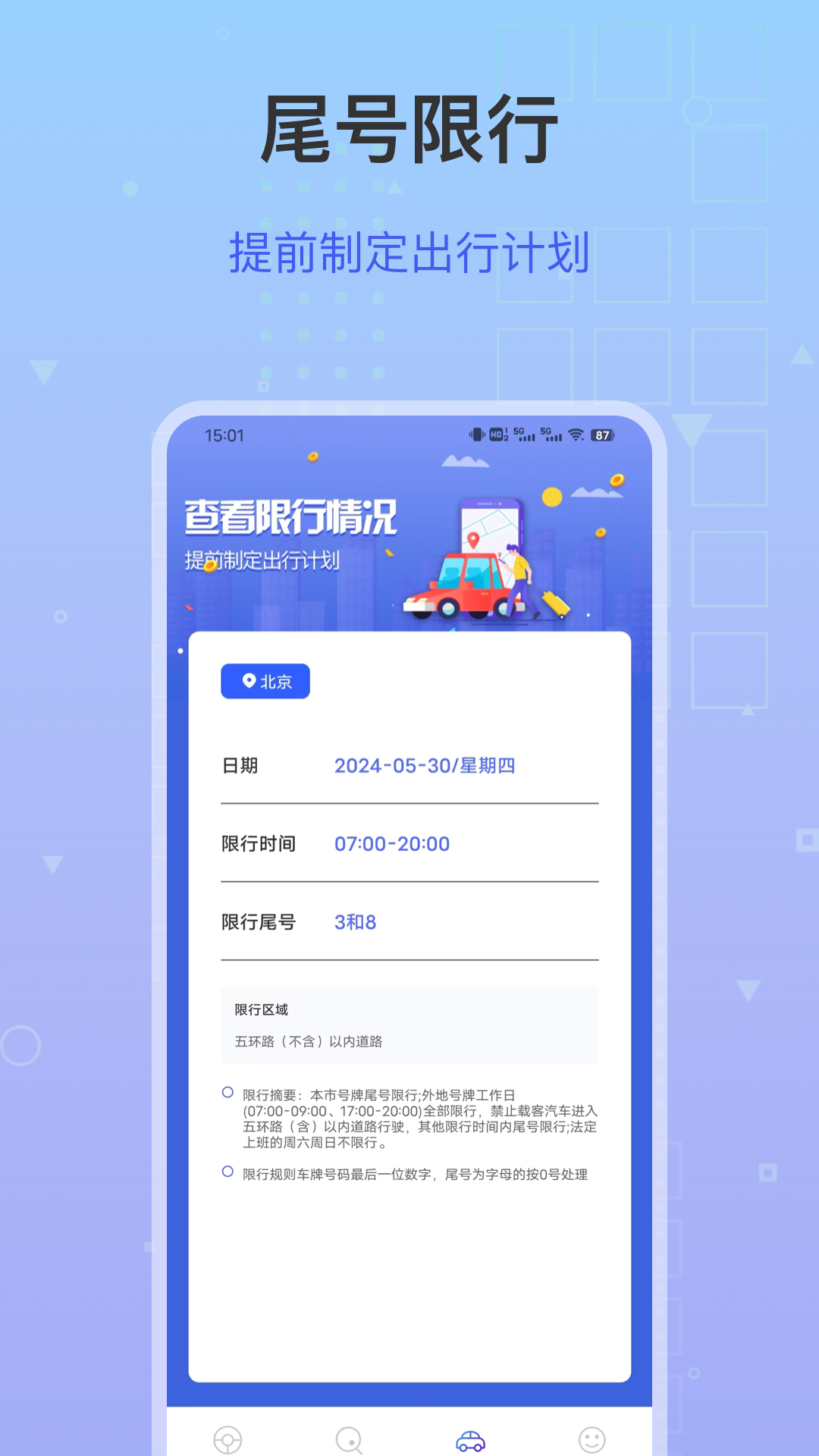 【尾号限行】可实时查询多个城市的尾号限行规则,以及规则的变动情况,让您不再担忧汽车尾号违章而被扣分。