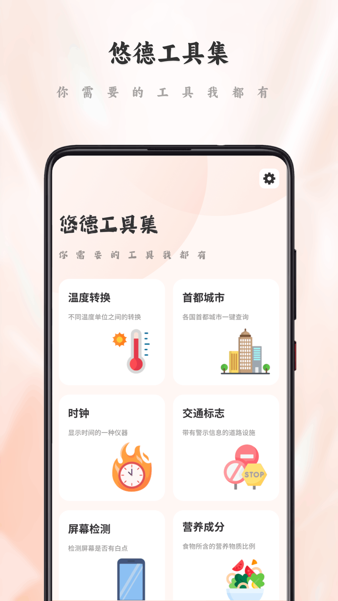 悠德工具集是一款集合了多种日常实用小工具的APP。包含温度转换、首都城市、时钟、交通标志、屏幕检测、营养成分等等多种日常实用功能。一款APP让您实现多种功能体验,希望悠德工具集成为您的日常生活好帮手。