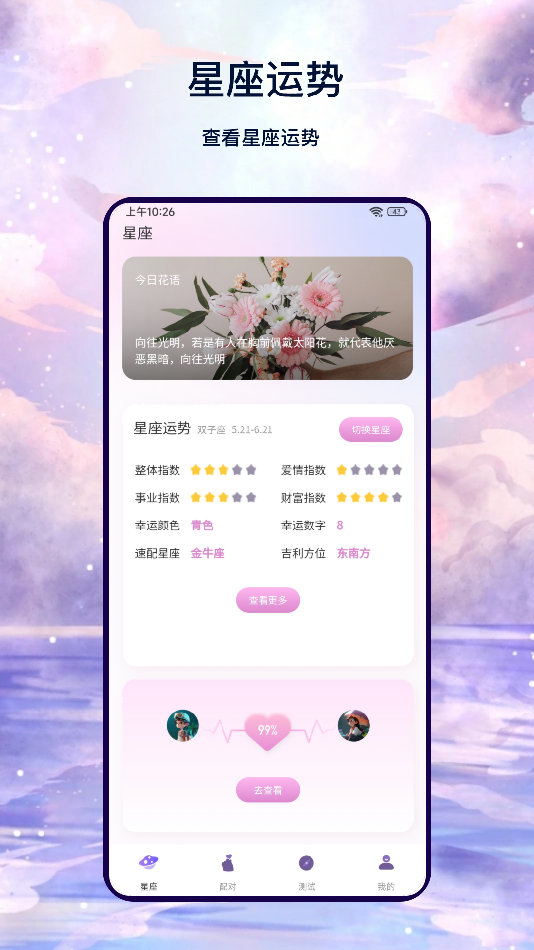 这里有星座配对、星座与生肖的配对、星座与血型的配对等内容,可以测试你和恋人之间的爱情指数,还有心理方面的分析哦。