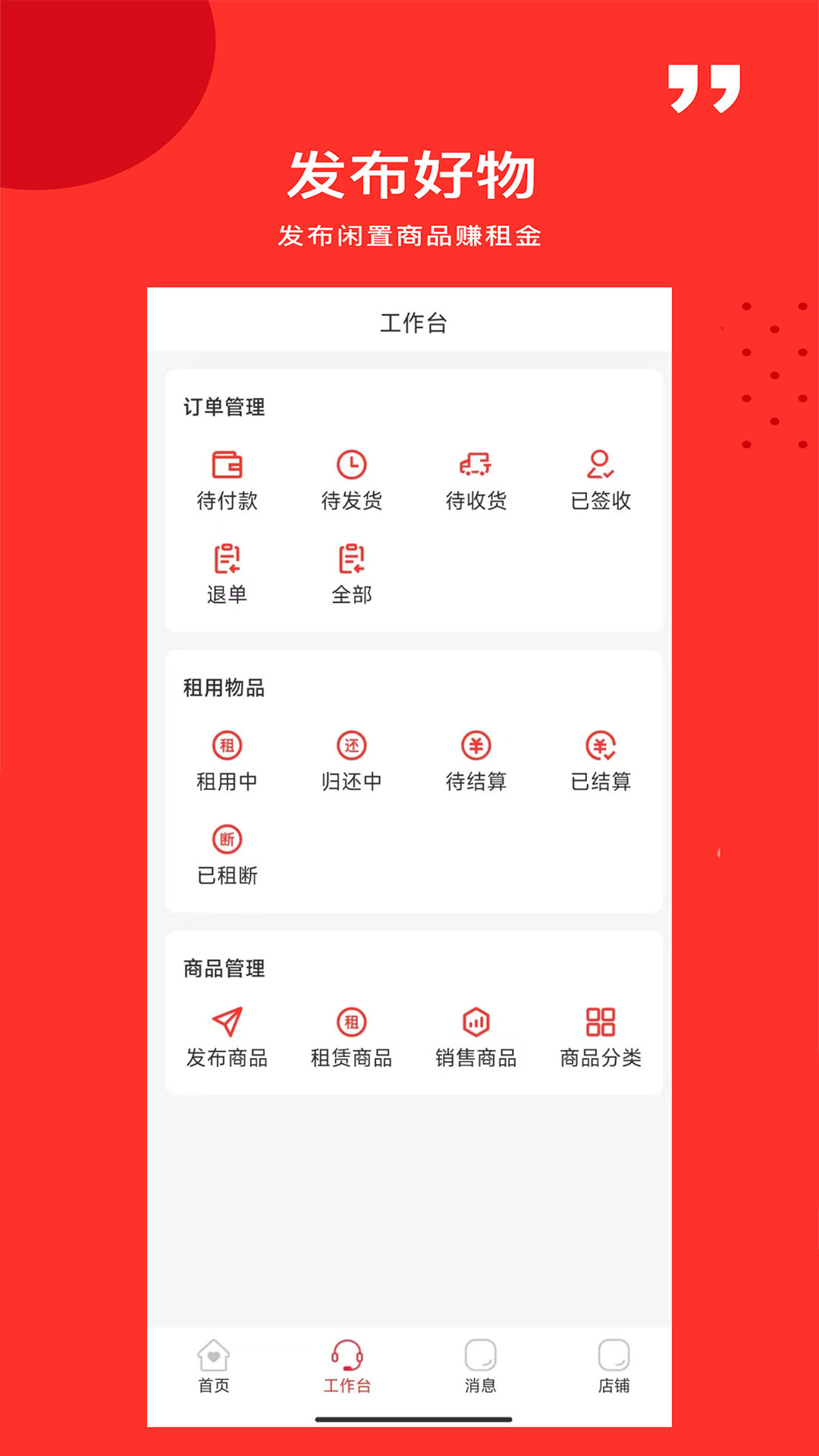 为企业和个人提供一站式信用免押租赁服务管理平台, 商家在APP上管理自己的商品、用户, 实时与用户沟通对接。