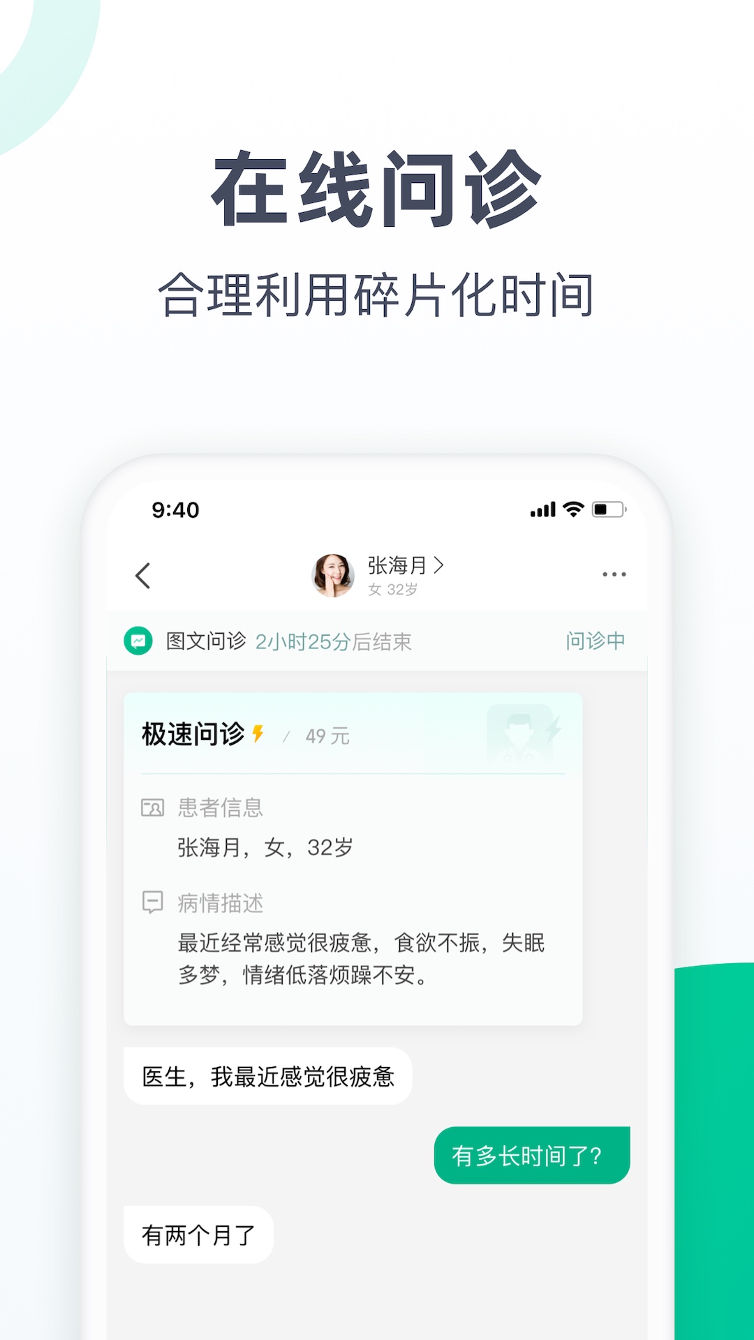 其二,在线问诊服务。医生能够在系统设定的特定时段内,以图文、电话或者语音等形式,为更多患者提供专业的医学咨询服务。其中,专家的图文问诊和电话问诊可以自行定价;而极速问诊服务则由平台统一规定价格,并进行定向结算。