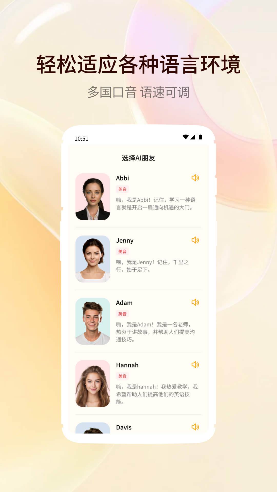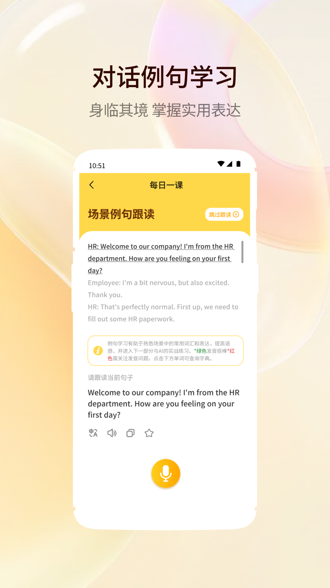 这是一款以数问科技语音引擎为基础开发而成的工具,专为在职人群打造,用于对话练习。它具备多种功能,其中包含丰富多样的职场口语卡片,还设有语法练习以及例句跟读等功能。这些功能能够助力用户改进发音,提高语法水平,增强表达能力。