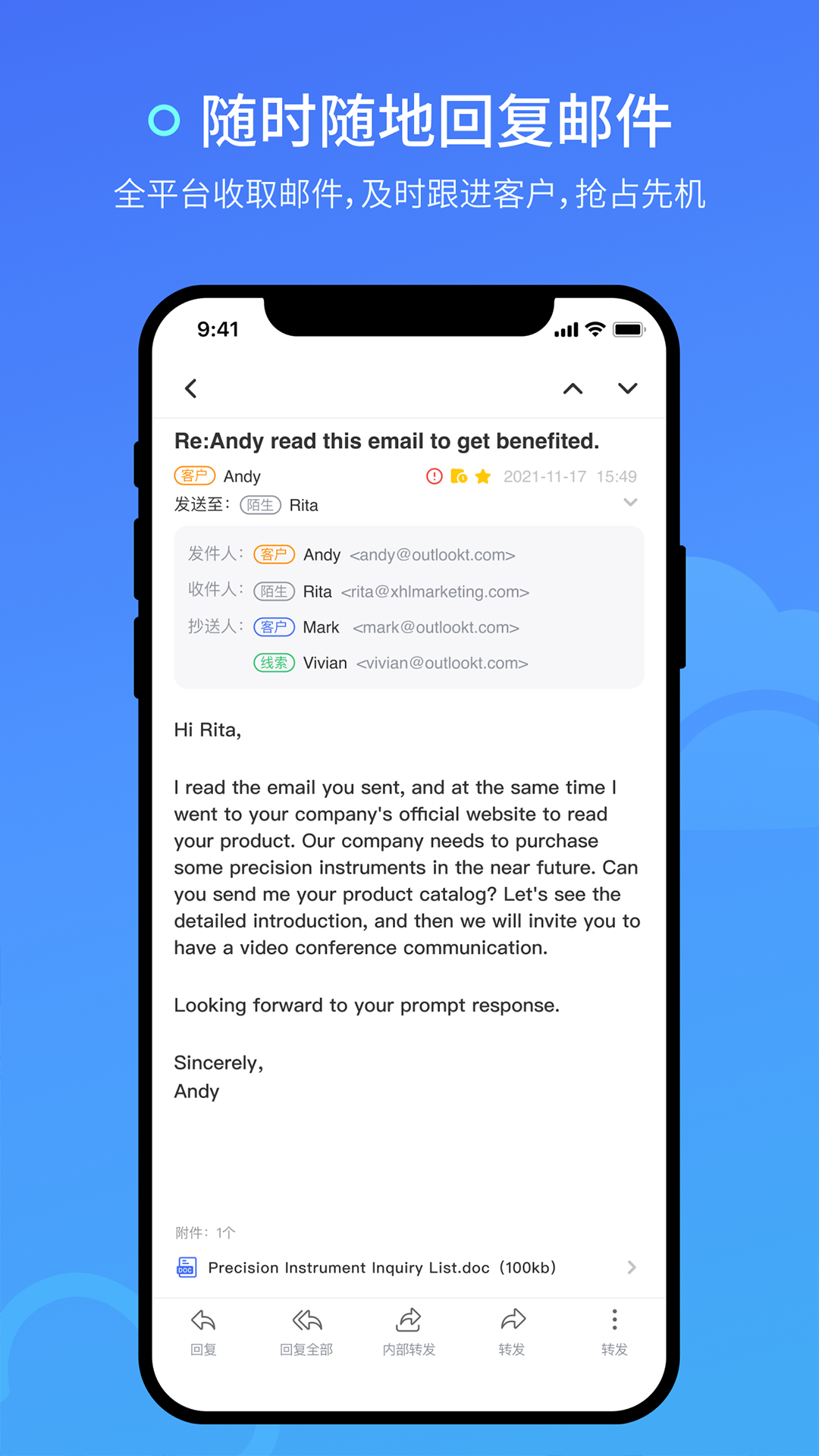 邮件模块数据多端同步,新邮件消息提醒,及时回复客户邮件,提升触达客户效率;快速识别邮件联系人的客户类型,一键查看往来邮件及附件。