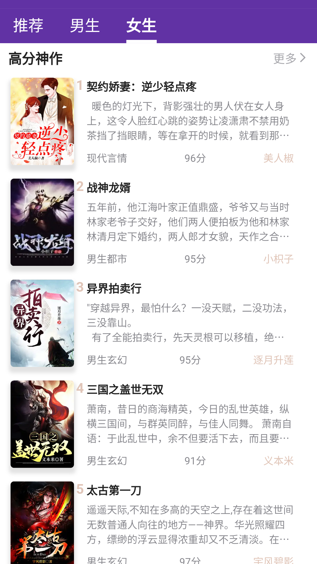 小说详情页面展示封面、作者、评分、简介等信息。