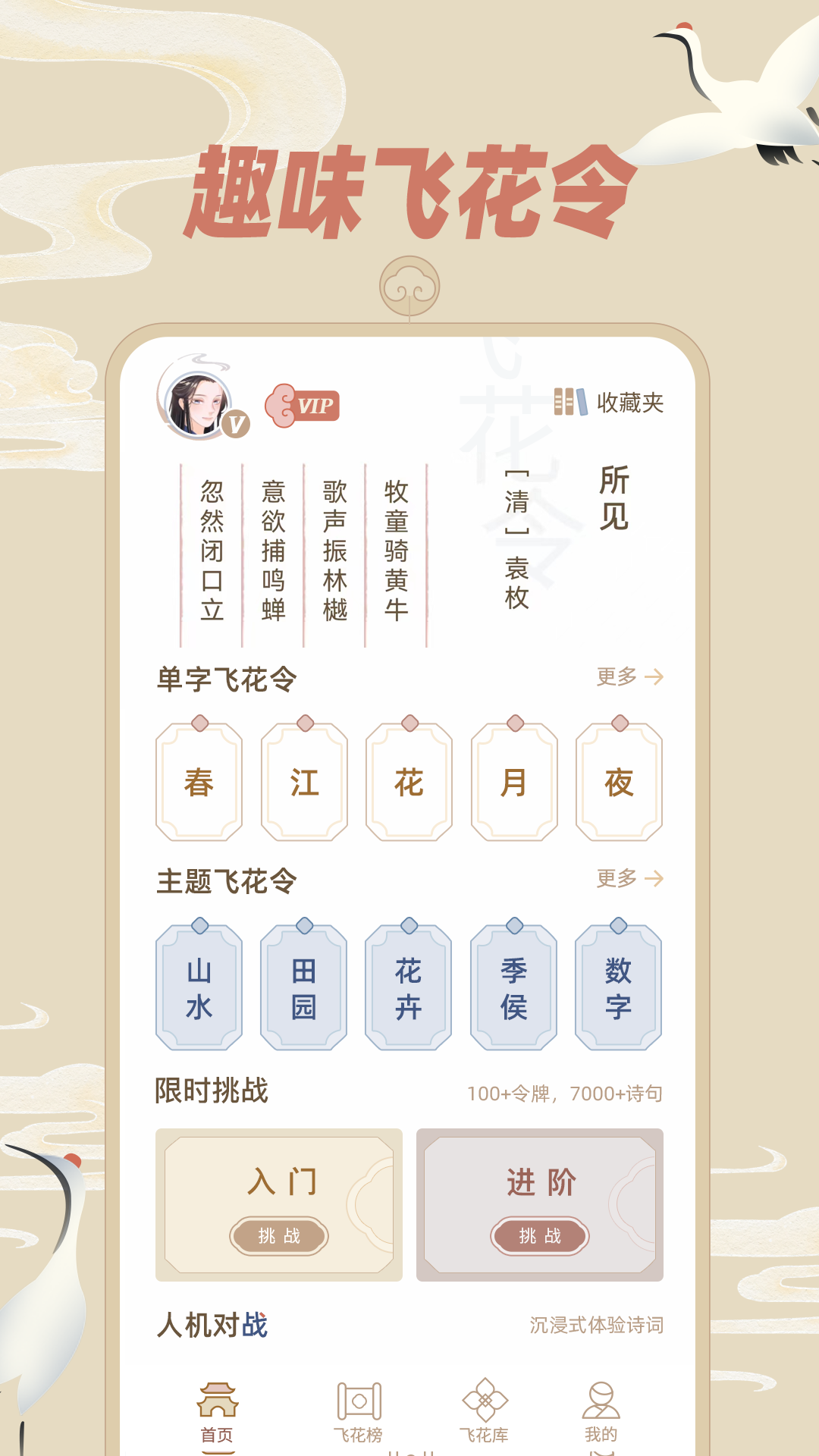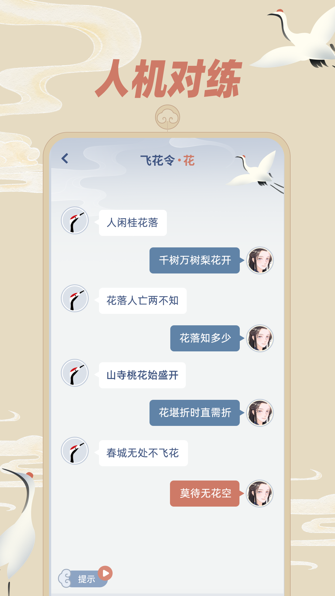 【人机对战】是对学习成果进行检验的环节,基于之前的学习成果来进行挑战检验,有单字飞花和主题飞花这两个选项,用户可以与人机一同对战飞花令,挑战自己飞花令知识储备的极限,快速提升飞花令的水平。