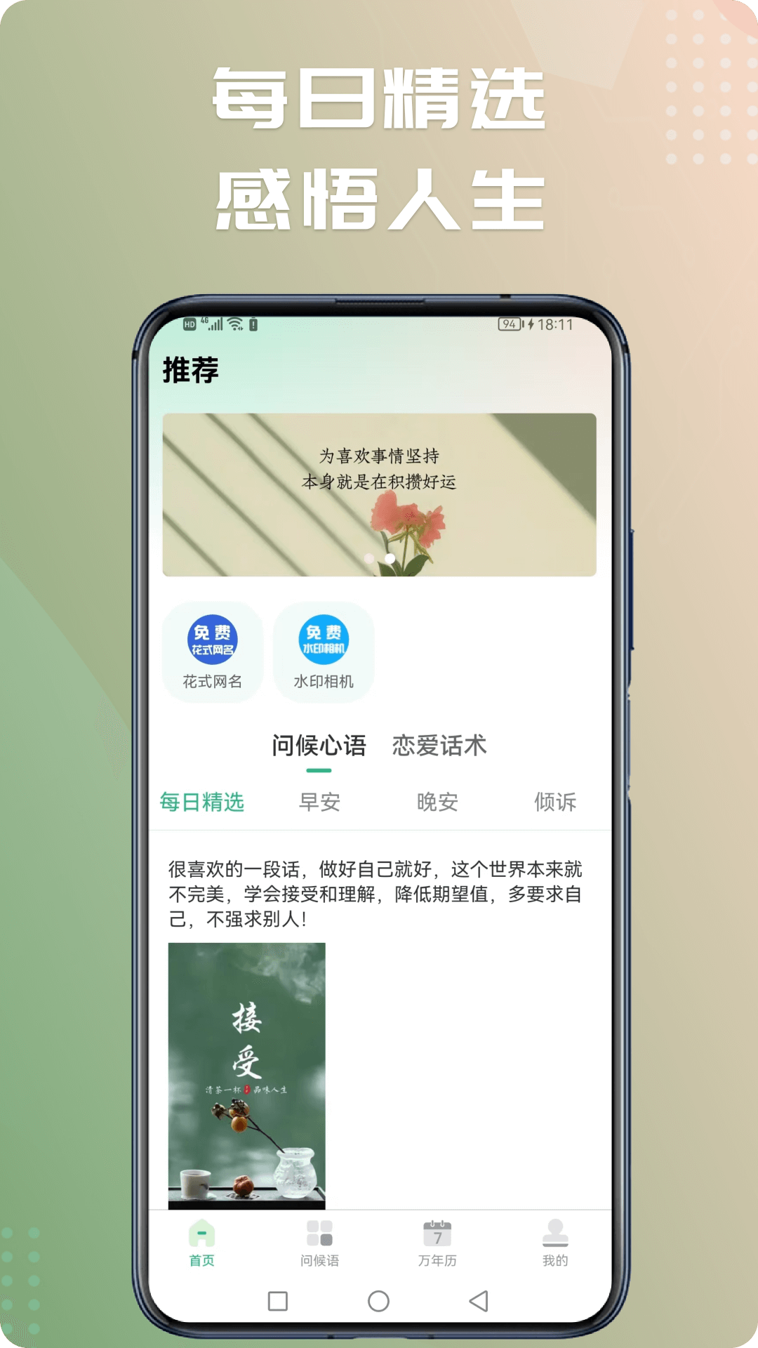 每日更新的问候语:我们的开发团队精心挑选每日一句正能量语录,搭配美丽的图片背景,为您的早晨增添一抹亮色。
