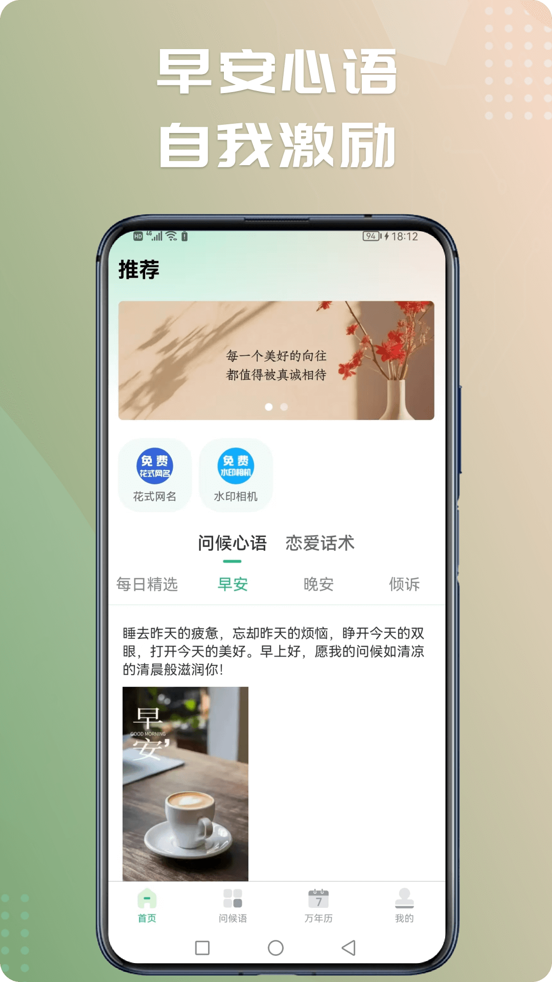 “早安图片问候语”专注于为用户提供各种早安问候语,晚安语录,早安祝福语,节日祝福语,正能量语录,并智能匹配精美的图片,同时可一键生成日签图片,帮助用户轻松分享到朋友圈,为朋友和家人带去一天的好心情。从而以积极的态度迎接新的一天。
