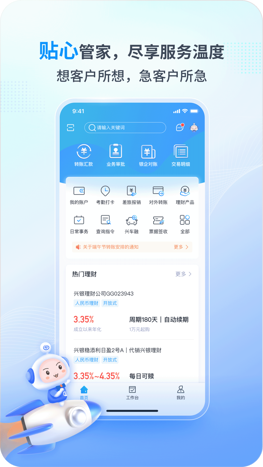 “兴业管家”是一个面向机关社团企事业单位客户的线上金融服务平台,具有开放式、一体化、综合性的特点。它为用户打造了安全、便捷的金融服务环境,使用户能够轻松享受财富管理、融资服务、支付结算、跨境金融、工资代发等金融服务。并且,用户还能愉快地体验与企业日常生产经营相关的非金融服务,秉持“管钱管事,开放共赢”的理念。