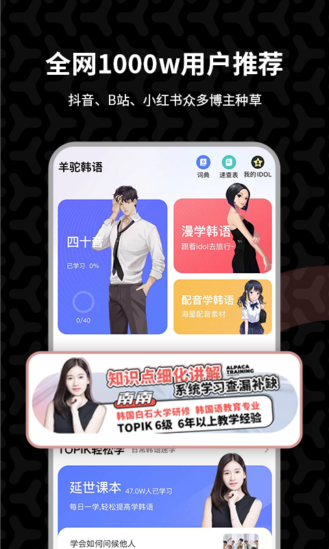 羊驼韩语,这是一款专门为韩语爱好者精心打造的韩语学习软件哦。