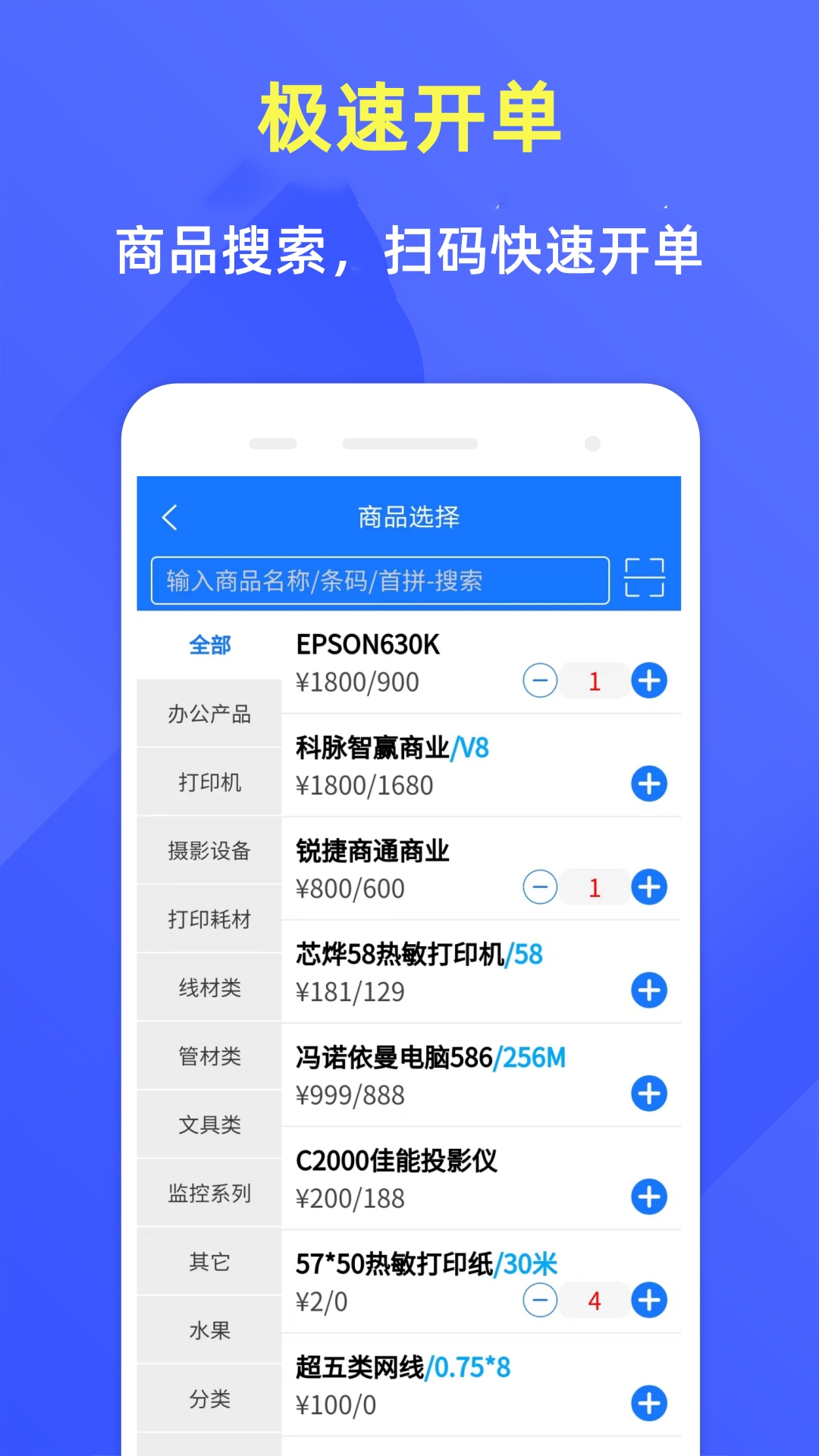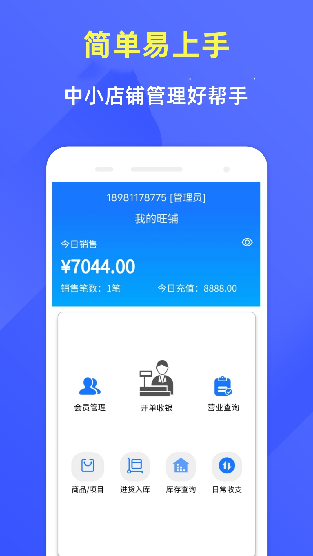 商品管理、商品分类、会员储值积分消费管理、供应商管理、销售开单收银、采购进货、库存查询盘点、日常收支管理、销售报表、进货报表、经营状况、利润报表、业绩报表、收银员收银报表统计等。