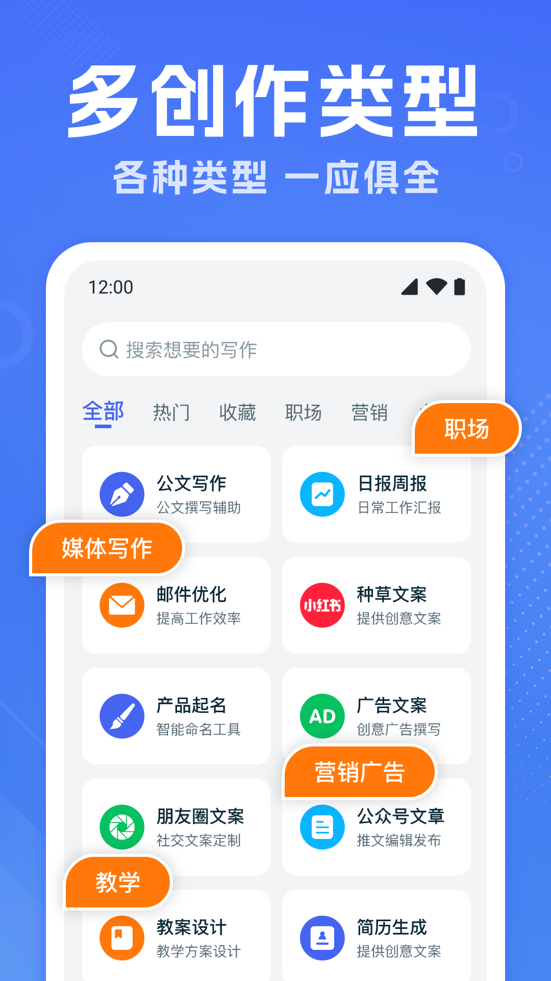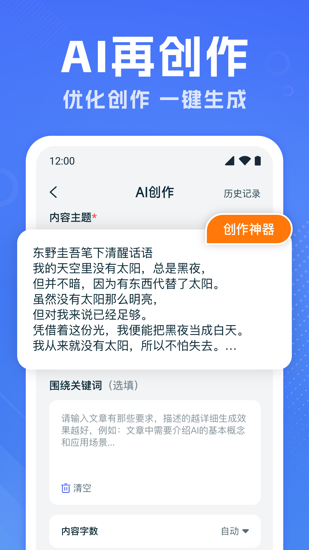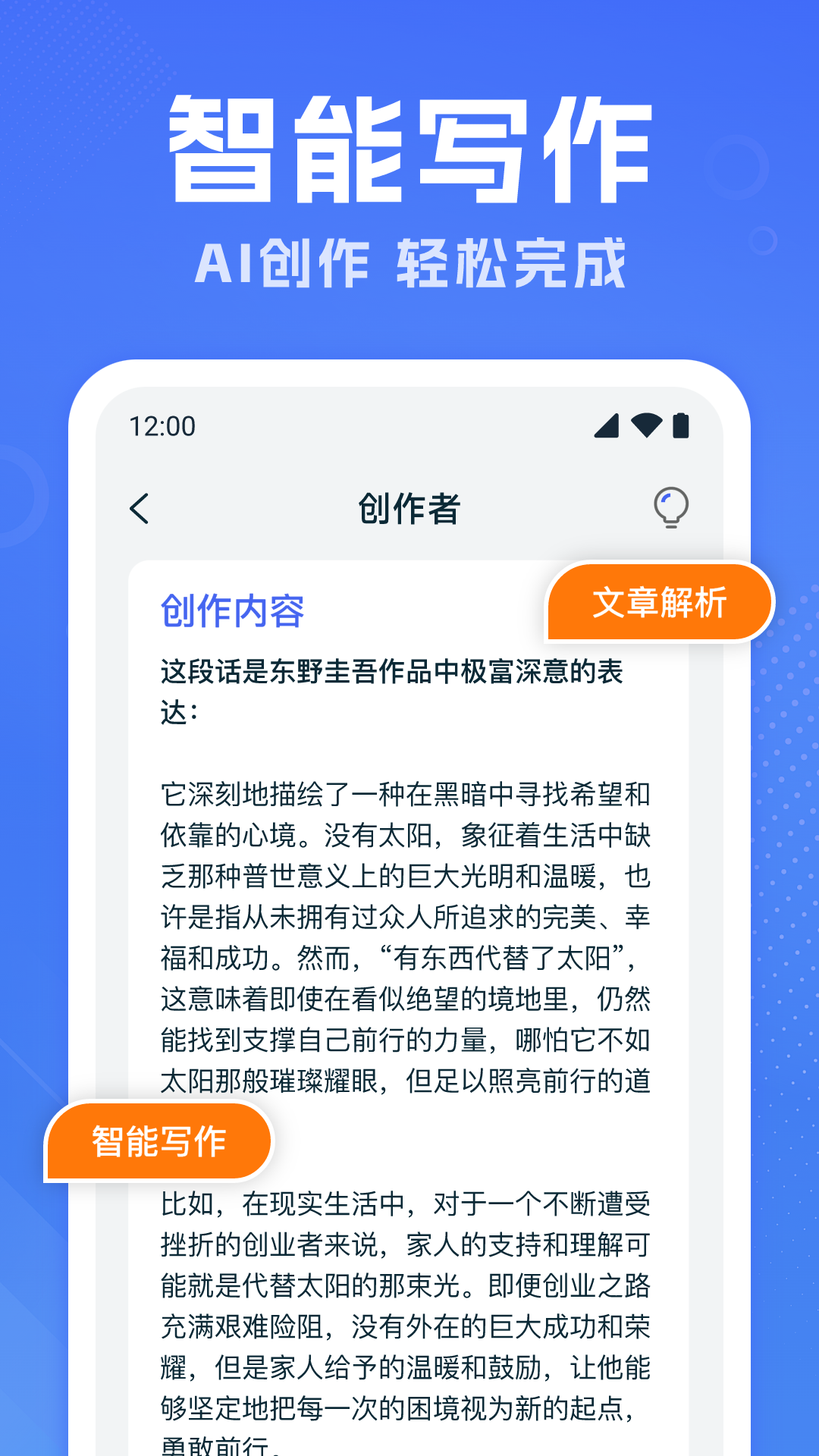 AI 写作家是一款极具实力的 AI 智能写作软件,能够巧妙运用人工智能实现高效的内容整合创作。不管你在生活中遭遇何种麻烦,学习上碰到怎样的难题,亦或是工作中面临何种困扰,它都能迅速给出有效的解决方案。 【灵感创作】 AI 写作家宛如创意无限的大师,无论是吸睛的广告标语、生动的朋友圈文案,还是精彩的故事脚本、深情的告白信、全面的工作总结、严谨的调研报告等等,都能游刃有余地完成,让灵感不再干涸。在这里,创意如同璀璨星辰般闪耀,为你的创作之路增添无尽光彩。 【小说续写】 仅需提供关键词和故事梗概,AI 写作家便能依你所需,为你打造独特的小说情节,使你的创作绽放独特魅力。它恰似一位充满魔力的故事编织者,为你构建出一个个奇幻美妙的小说天地。 【智能问答】 被搜索引擎里纷繁的广告弄得不胜其烦?那不妨试试这款 AI 写作助手。它能够针对你提出的各种疑问给出科学合理的回答。无论是学业上的困惑、工作中的难题,还是生活里的疑问,它都能为你提供优质的解答与有力的帮助,成为你探索知识途中的可靠伙伴。 【公文起草】 公文撰写不再犯难!AI 写作助手为你提供强大的公文助手功能,助力你快速创作出专业、准确的公文。不管是商务合同、工作汇报还是申请文件,它都能提供一站式的文档处理方案,为你节省大量的时间和精力。 选择 AI 写作家,让它成为你创作征程中的得力助手,开启属于你的精彩创作新旅程。