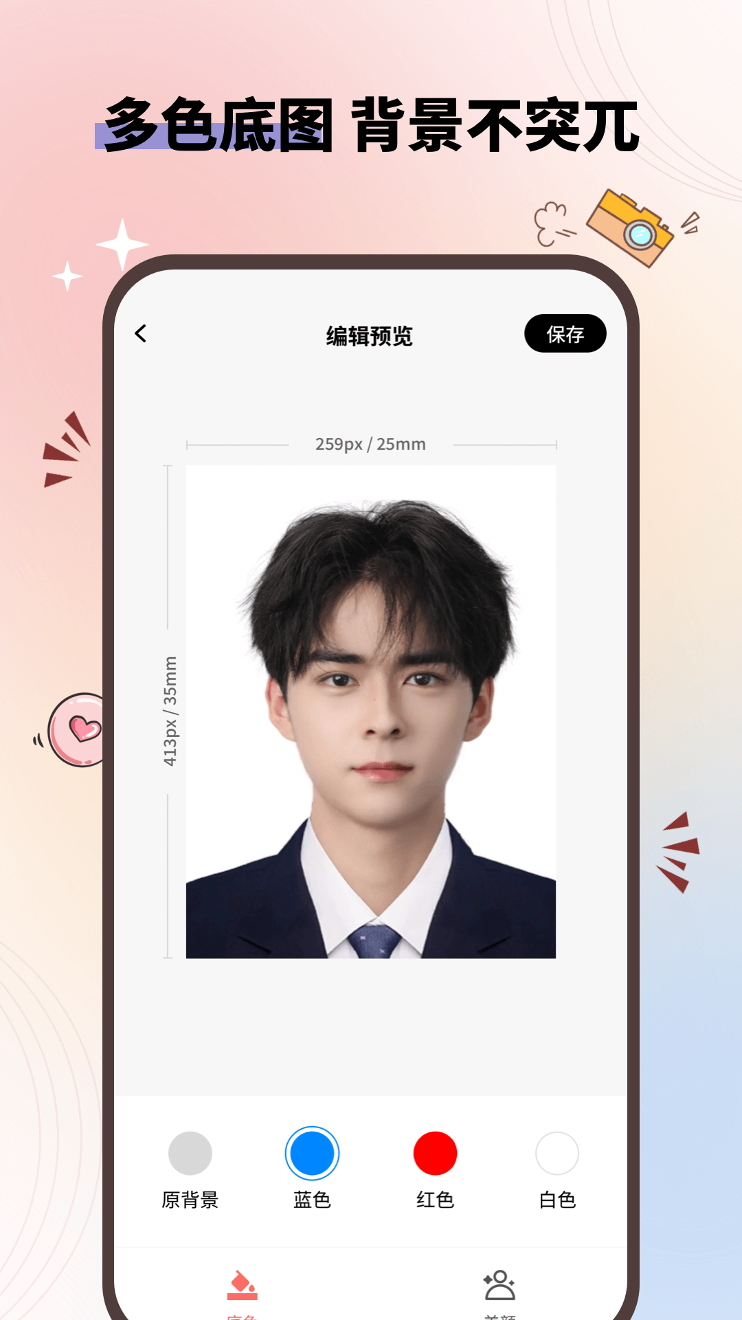 无论是一寸证件照,还是学生证件照、工作证件照,都能通过手机随时随地制作。而且证件照底色可以一键更换,有多种背景色供您挑选。