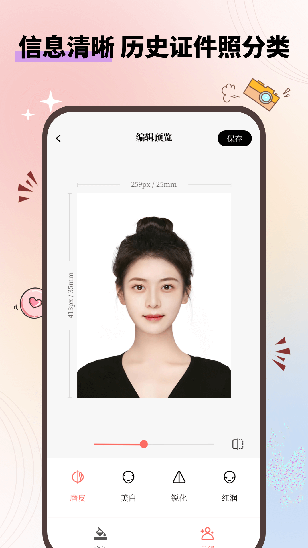 借助AI智能研究算法,这里有磨皮、美白、五官立体、瘦脸、小脸、发际线调整、法令纹淡化、黑眼圈消除、亮眼等美颜功能。还有特别适合懒人和手残党的一键式化妆功能,通过人像识别,无论是自然妆、清新妆、元气妆,还是男神妆、女神妆,都能满足您的需求,同时支持自定义妆容程度。一键就能还原最美最真实的您,塑造完美、自然且充满高级感的脸庞,让您彻底告别证照不好看的时代。