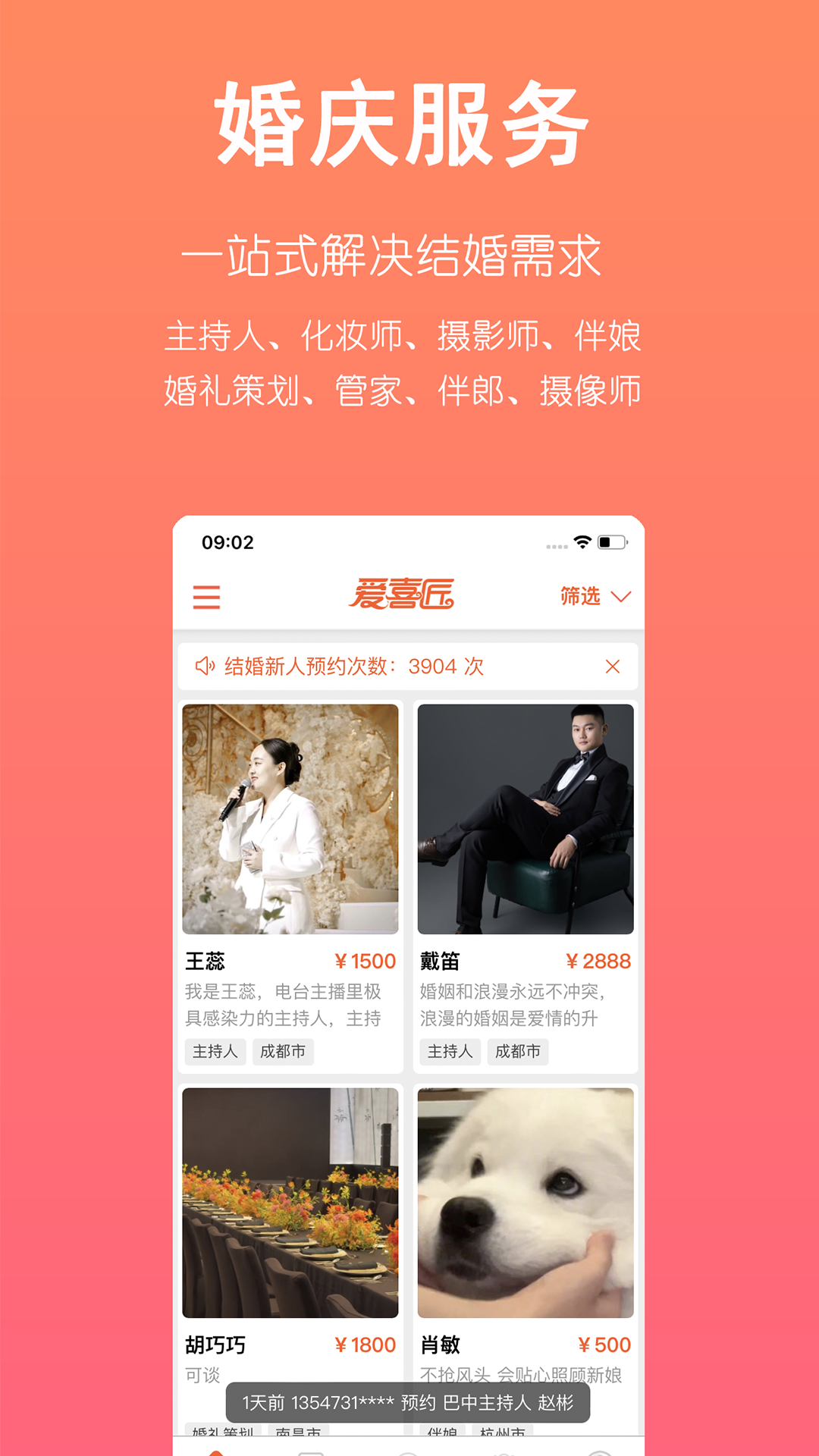 - 免费预约:可以轻松预约到遍布300个城市的婚礼服务人员。
