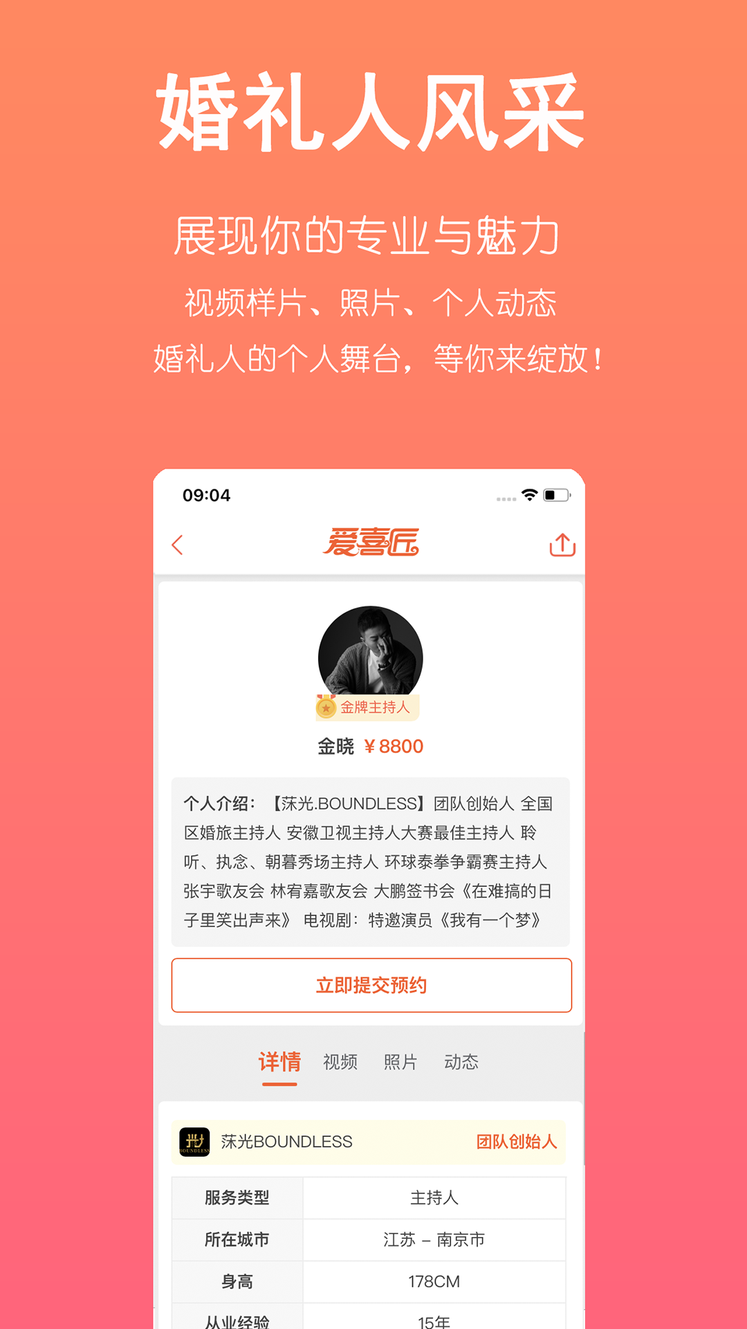 想打造一场完美的婚礼吗?那就从“爱喜匠”同城婚庆服务预约平台开始吧!这是一款专门为求婚、订婚、结婚精心打造的全方位服务APP。在这里,您能够从全国300个城市的众多婚礼服务人员里挑选心仪之人,不管是经验丰富的婚礼主持人、技术精湛的摄影师,还是巧手的化妆师以及创意无限的策划团队,爱喜匠都能为您精准匹配到合适的人选。并且,我们对服务人员进行了严格筛选,确保每一位都是真实可靠的,从而让您的婚礼筹备无需担忧任何问题。