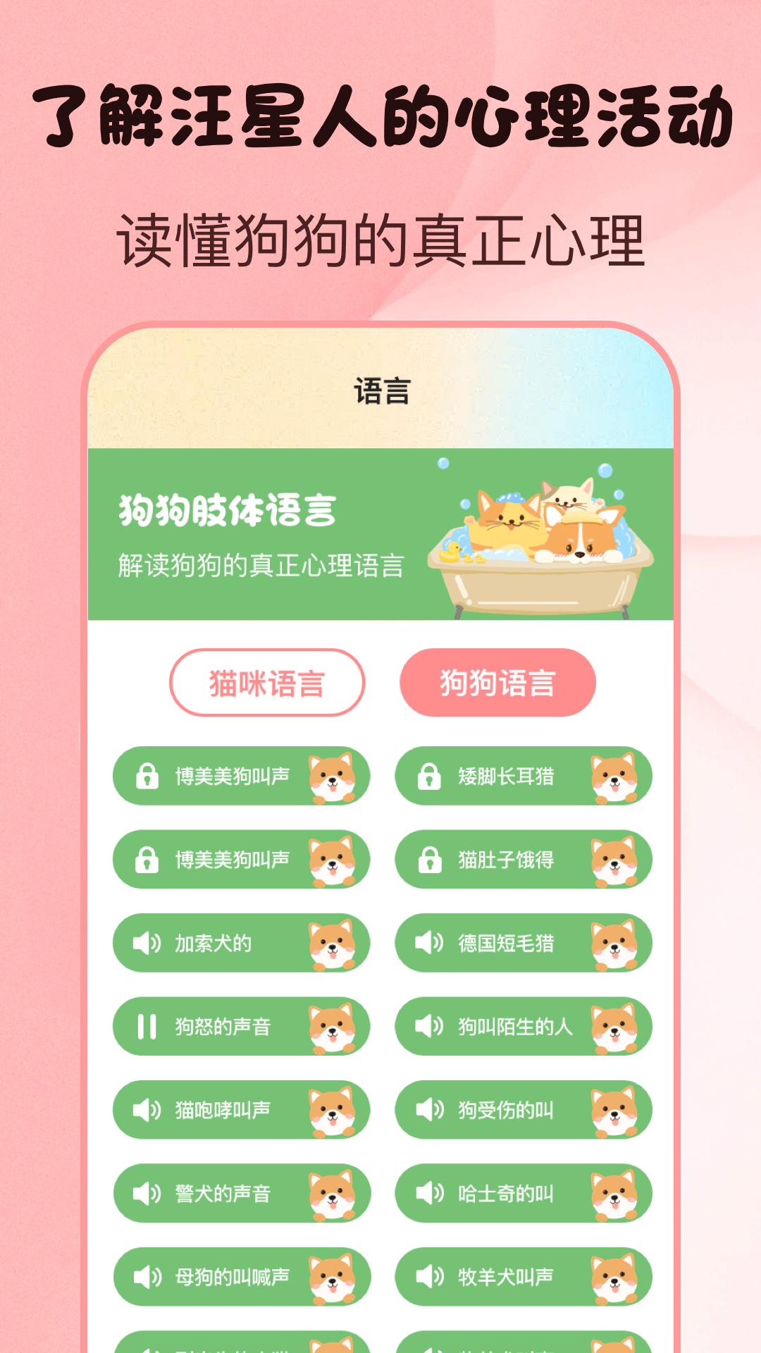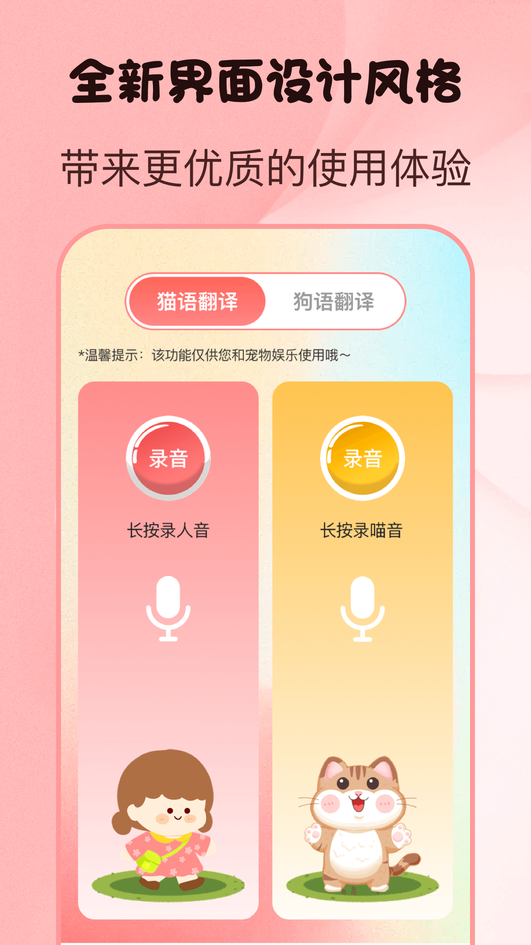 它配备了猫咪和狗狗各种各样的喵星人、汪星人语言,像表达委屈、开心、无语、呜咽、要去打针、愤怒、发狠等多种有趣的猫叫声都有,只有这样,您才能真正了解猫猫狗狗的常用语言,进而明白它们的心情哦!