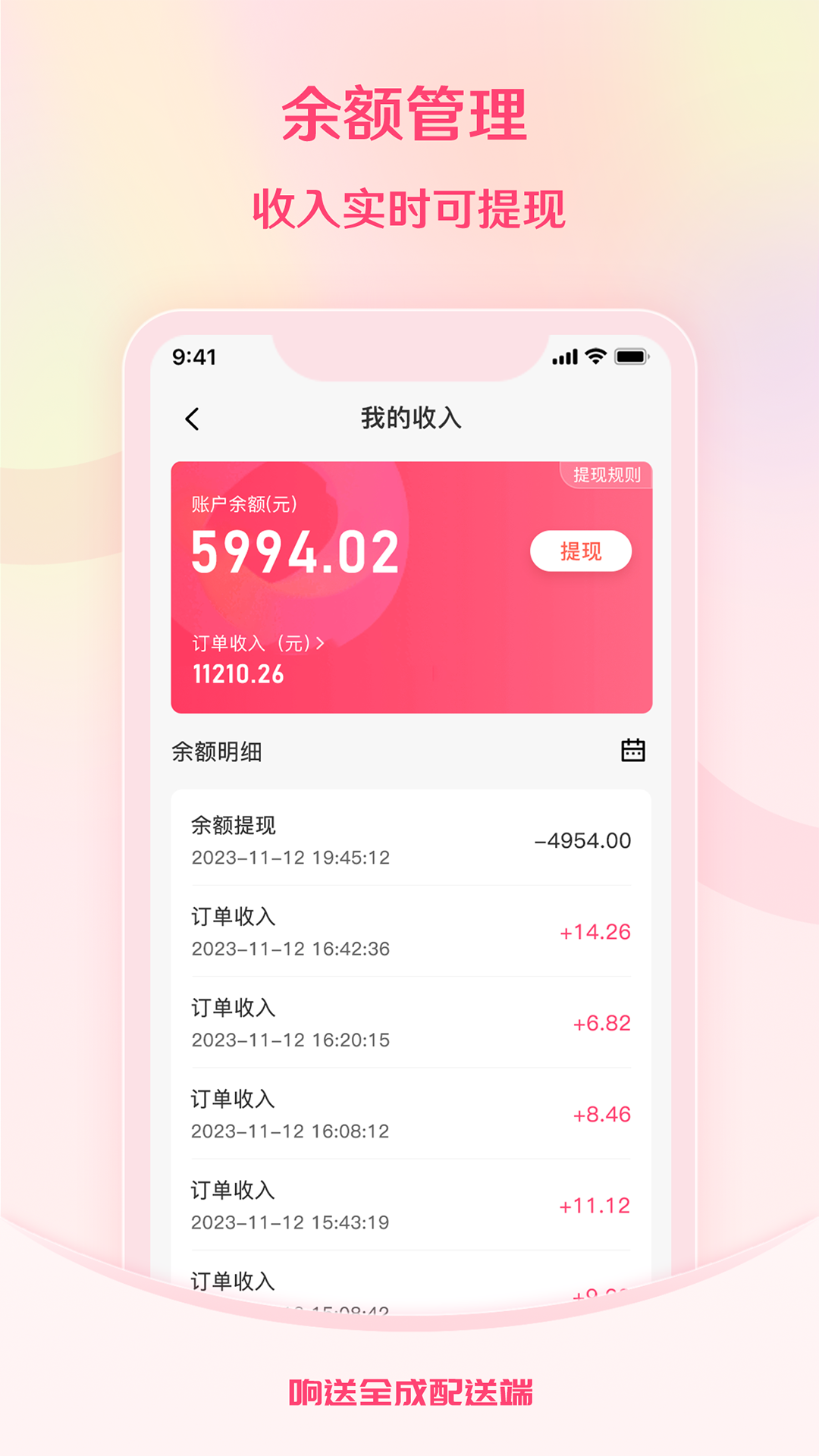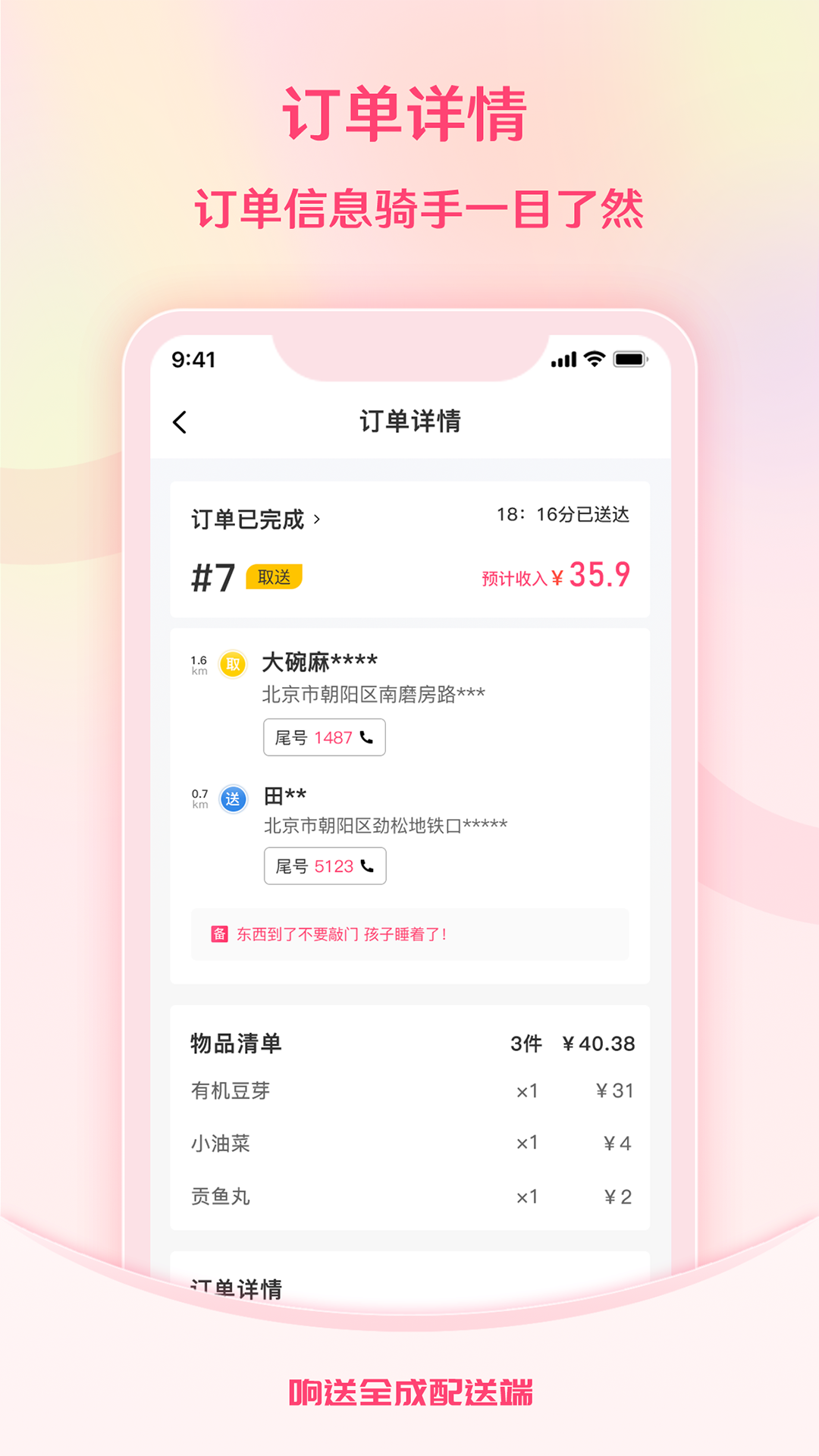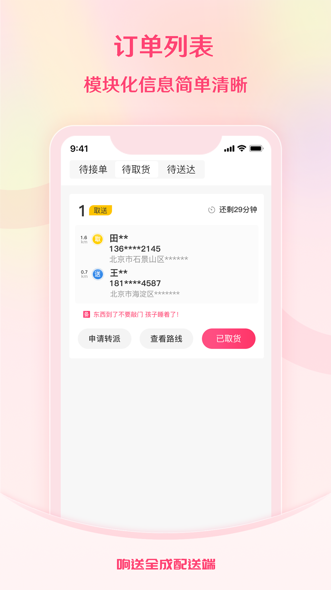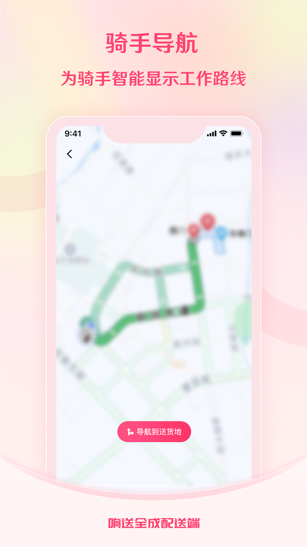 响送全成配送的骑手工作平台,为骑手提供7*24订单流程可视化,高效率、直观、稳定、便捷的工作终端系统。