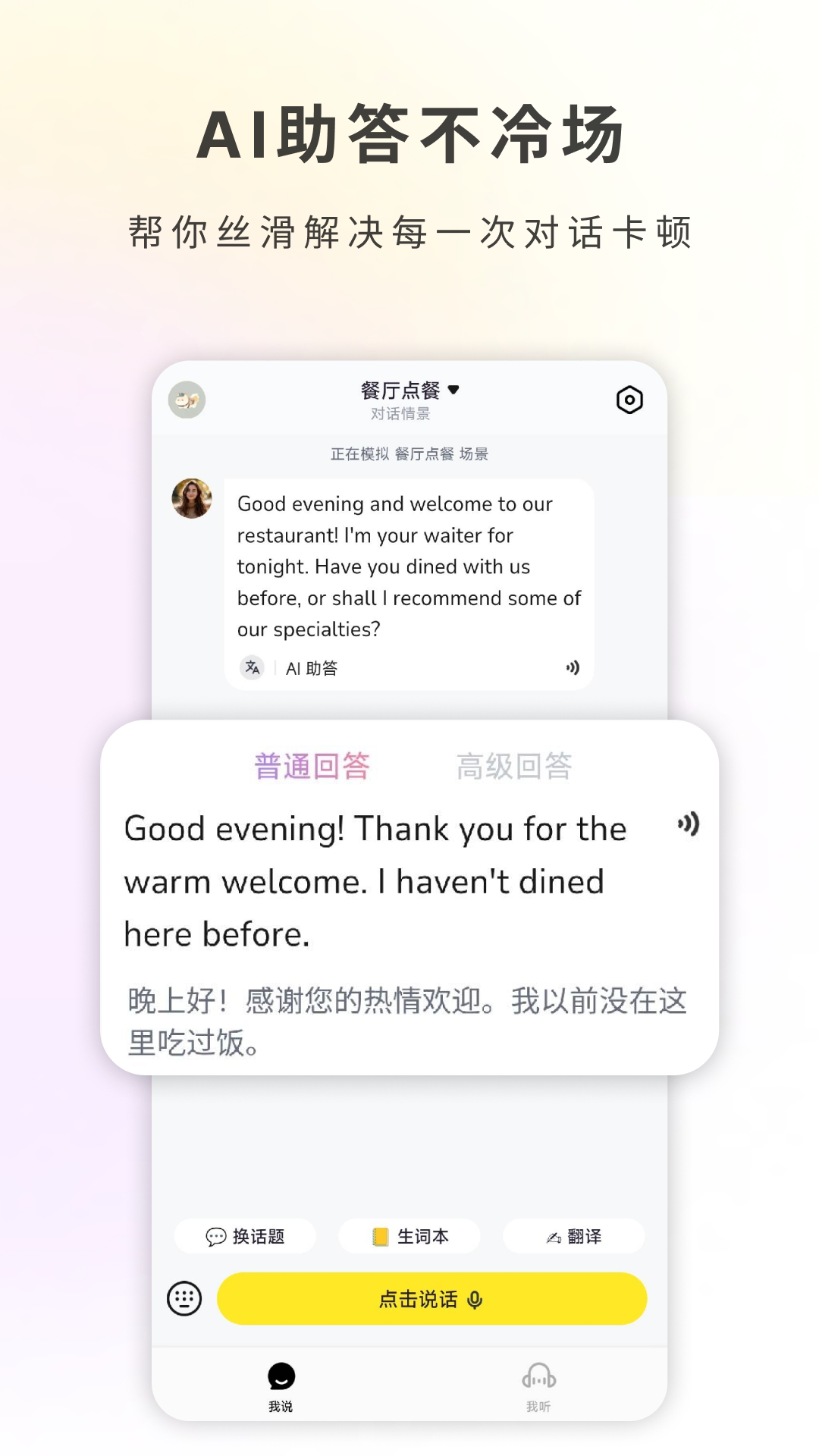 哑巴开口是一个AI英语口语互动陪练App,多种场景,智能纠错,让你告别哑巴英语,告别高价私教,告别预约课程,告别社交恐惧,更勇敢的说英语!开启英语口语学习新篇章!