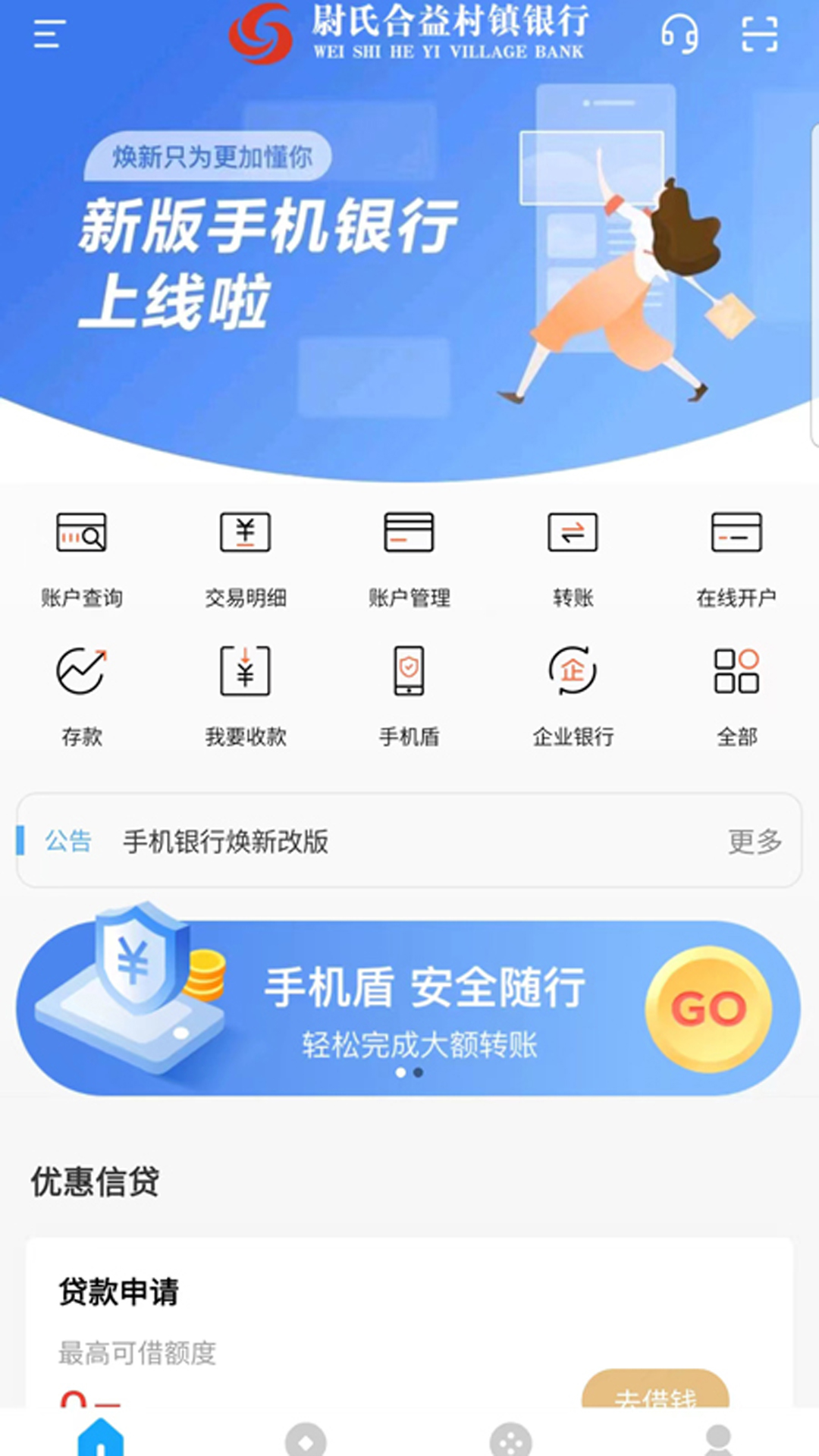 尉氏合益村镇银行手机银行客户端是尉氏合益村镇银行为客户量身打造的智能手机银行客户端,可以为您提供账户查询、账户管理、转账汇款、手机充值等功能的移动金融服务,让客户随时随地尊享7×24小时的贴身金融服务,轻松掌握账户资金动态,有效进行财富管理。此外,简洁流畅的UI设计,为您提供优良的使用体验。我行手机银行采用了多重密码保护机制,加以手机盾多重认证,保障您的交易资金安全。