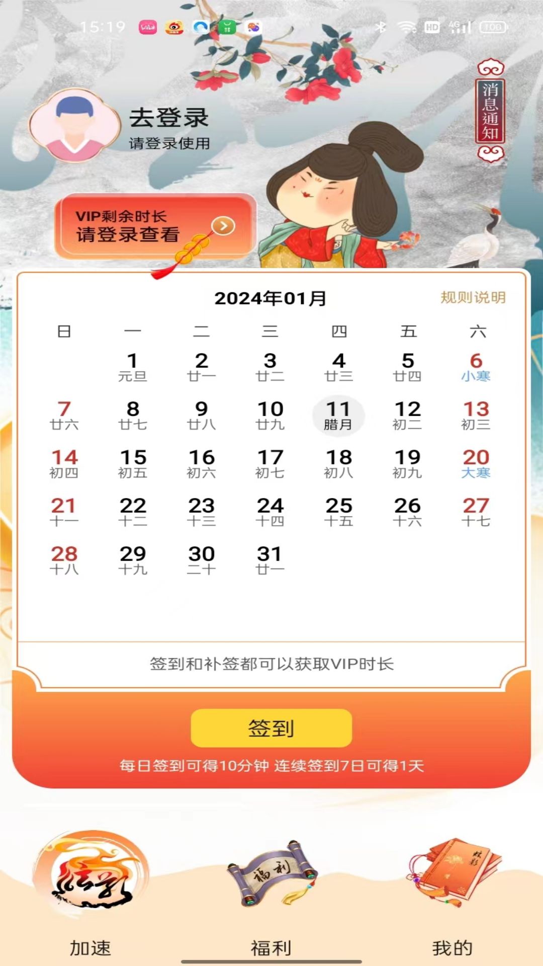 2. 连续签到7天就能获得1天的VIP时长。