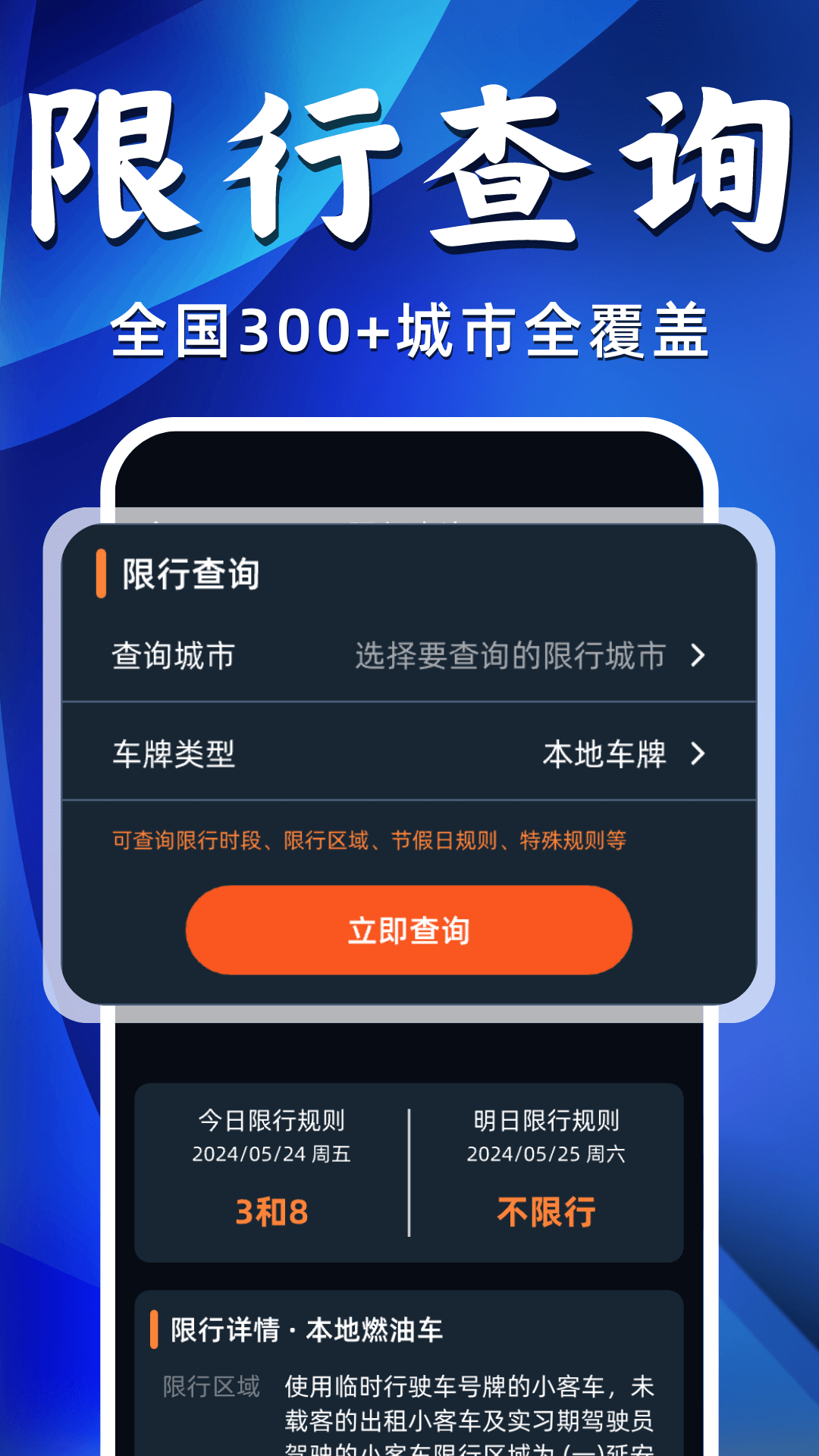 一键查询所在城市的限行信息,展示不同类型车辆在的限行尾号信息,同时还提供详细的限行要求,包括限行区域、限行规则和具体限行时间,让您及时掌握限行规则、更好地规划出行。