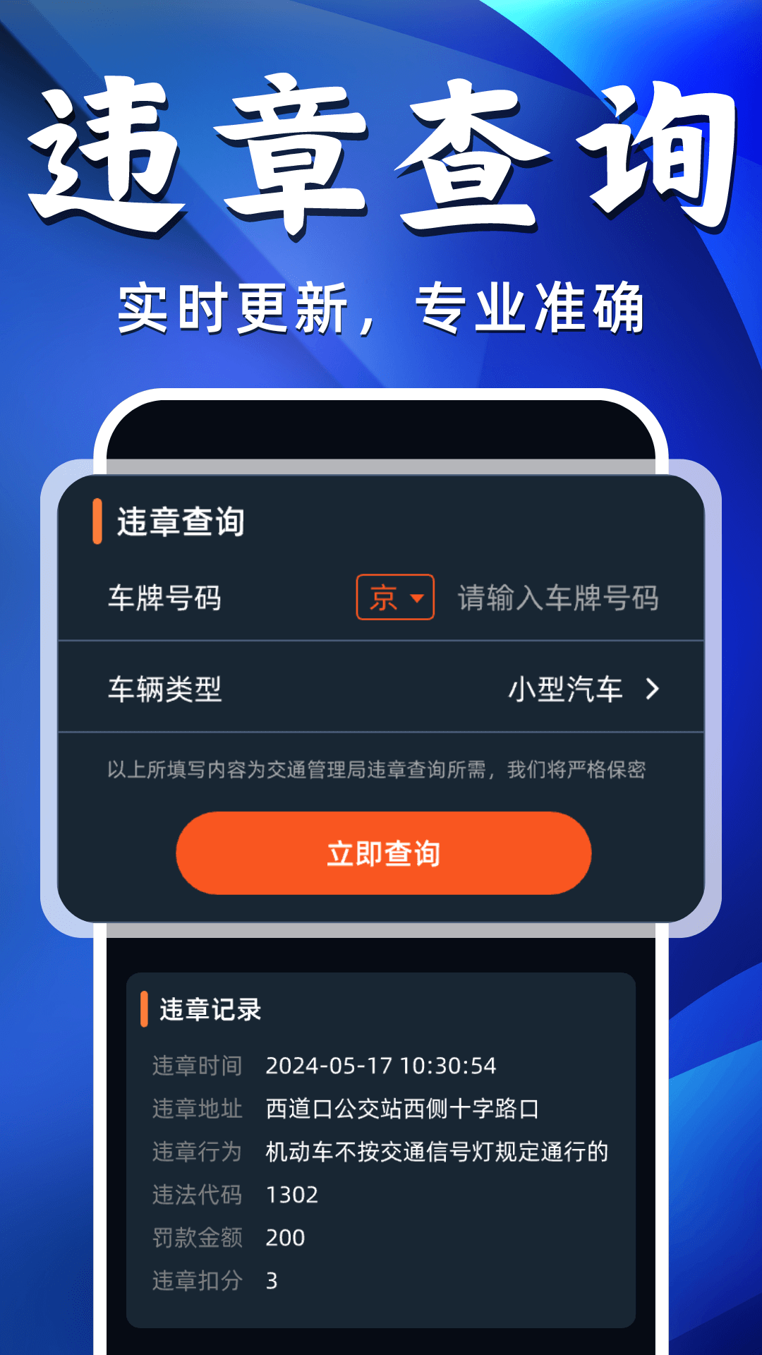 实时同步官方数据,覆盖全国范围内的违章查询服务。提供详细的违章信息,包括违章地点、违章时间、违章代码以及罚款金额等,帮助您详细了解违章行为。