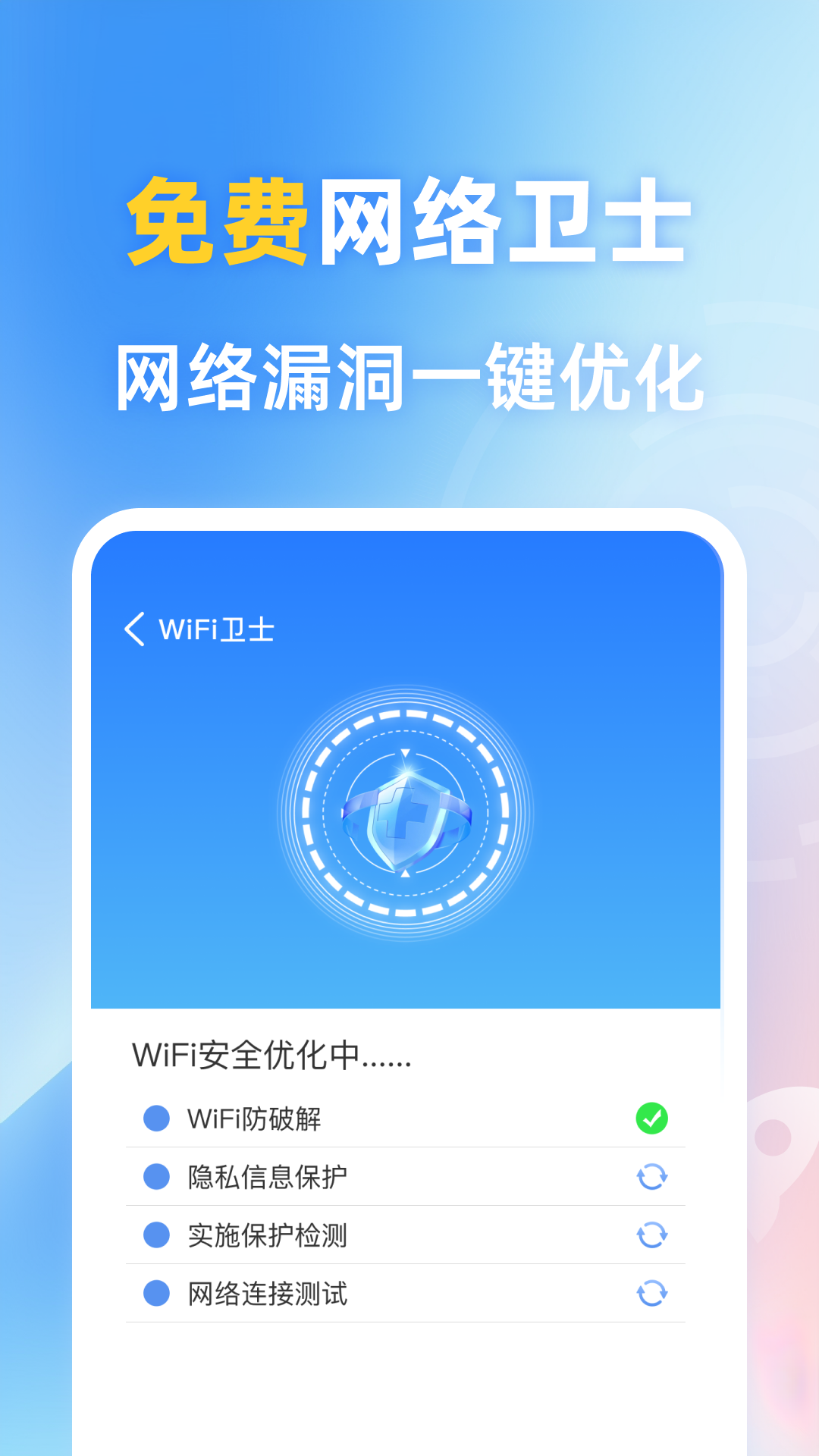 wifi钥匙免密连是一款多功能的无线网络连接工具,提供了蹭网设备清除、耗电优化、蹭网保护和WiFi卫士等功能,帮助用户更安全、更便捷地使用WiFi网络。