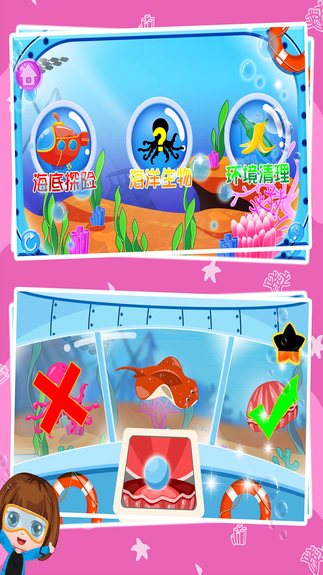 4. 环境清理:小朋友们可以通过操作屏幕移动潜水器来清理海底垃圾,这样能让宝宝们学会爱护环境,养成不乱丢垃圾的好习惯,同时明白海洋垃圾对海洋生物和鱼类的危害。