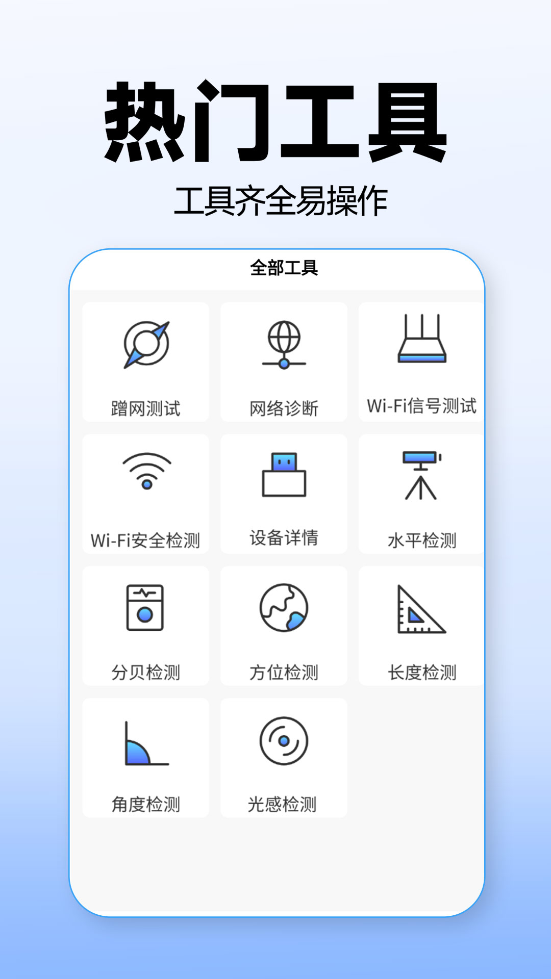 WiFi信号测试、蹭网测试、安全检测,网络诊断,一键测试当前网速的上传,下载,告别卡顿。还添加了许多实用的小工具如:水平检测、分贝检测、方位检测、长度、角度、光感检测等。