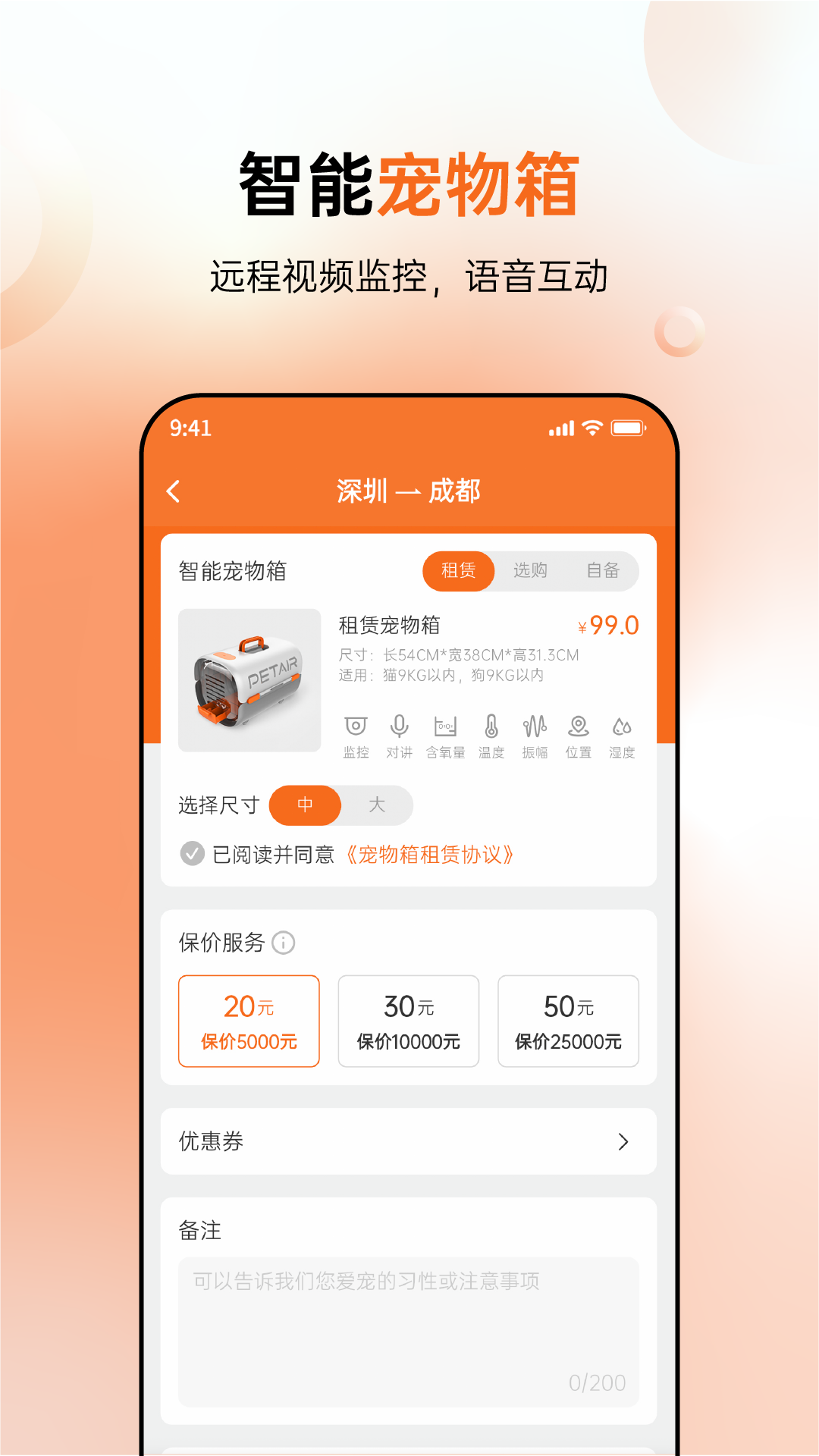 3.智能航空箱:独家研发专利技术,符合IATA航空标准。通过氧气传感器、温度湿度传感器,实时监控宠物环境数据,航空箱还设有语音互动,随时随地通话、安抚宠物情绪。