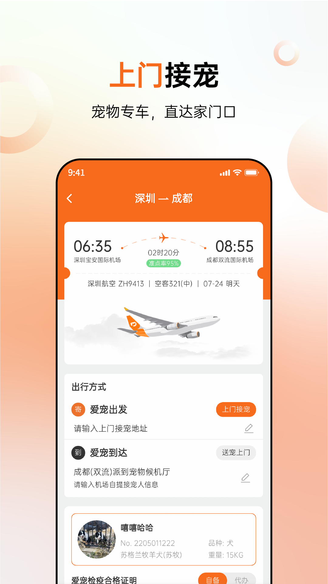5.派到提供便捷的快速订舱服务,让您优先选择宠物舱位,之后再轻松处理相关的检验检疫手续,省去了繁琐和等待的时间。为了确保您的宠物旅程体验顺畅,派到提供专业的现场陪同服务,助您和您的宠物快速、无障碍地抵达登机口。此外,我们还贴心准备了宠物客舱出行无忧礼包,让每一次飞行都成为您和爱宠的美好回忆!