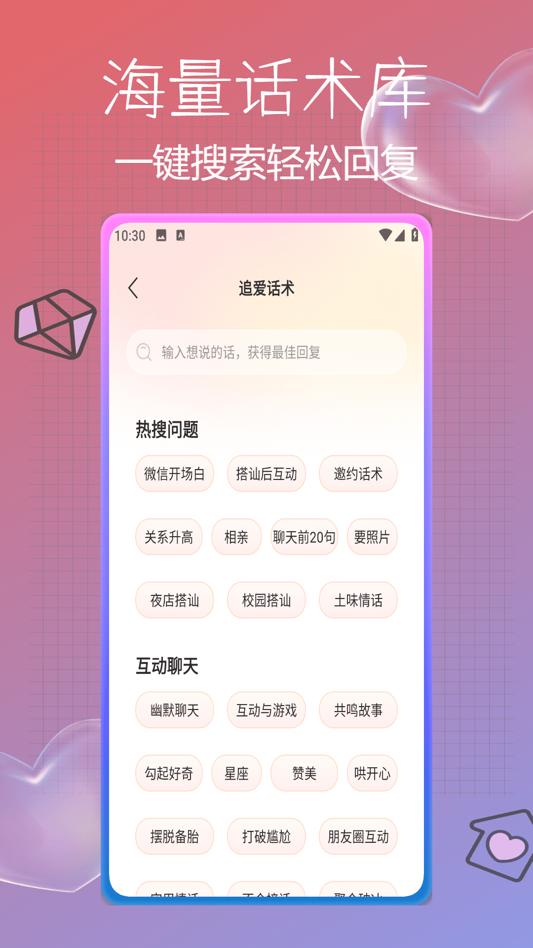 - **追爱话术**:这里涵盖了100多种聊天情景对话,让你在聊天时能够轻松自如,完全不会陷入尬聊的窘境。