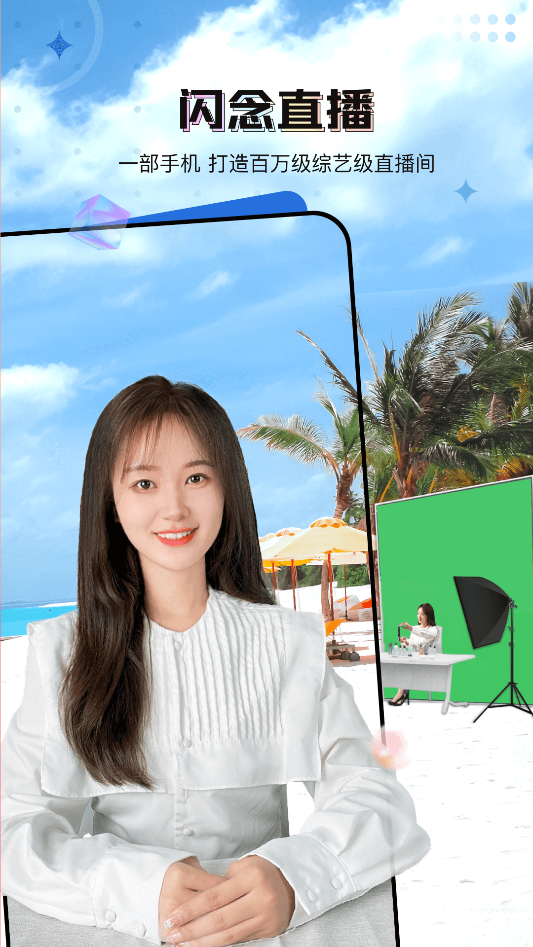 闪念,一款专业的绿幕直播工具。它能在直播时给予绿幕、美颜、滤镜、特效、多端推流、多机位等关键技术方面的支持,让“一个手机成为一个功能完备的直播间”这一理念得以实现。