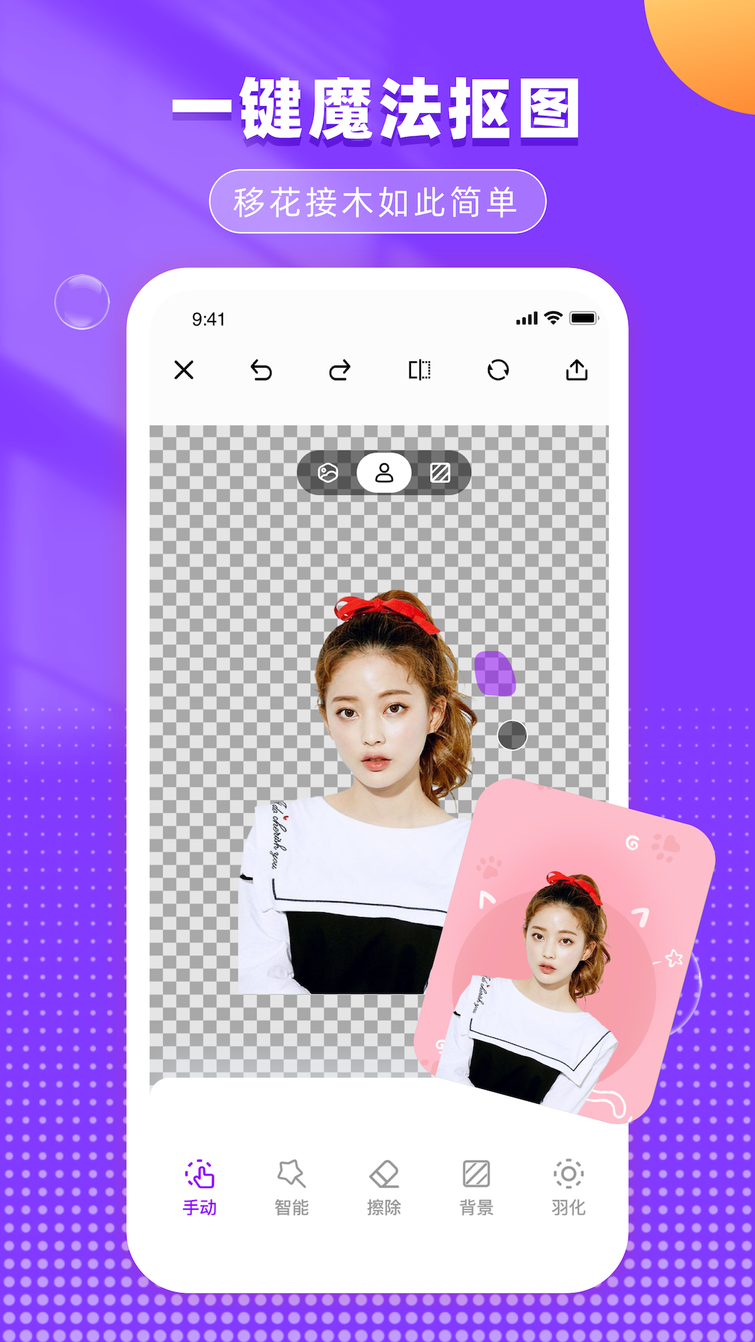 使用轻松抠图,数秒抠出需要的人物,数百种背景供你选择。