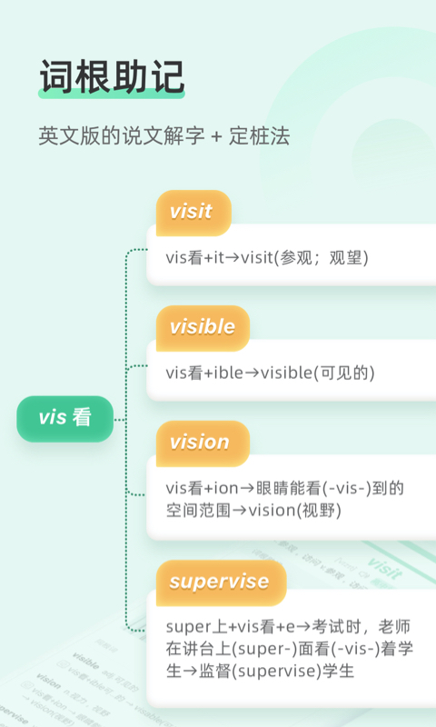 提供了七种助记方式:形近助记、词根助记、词缀派生、合成词、联想记忆、谐音记忆和图片记忆,对每个单词选择较优的方式帮你记住。