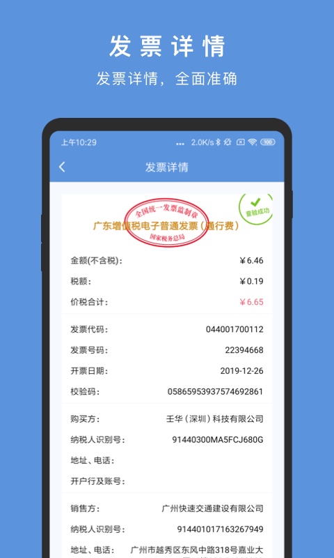 1. **发票查验**:利用APP或者扫码枪扫描发票二维码,不但能够查验发票的真伪,还可以获取发票所有的票面信息。而且,华票支持多种类型的发票,包括增值税专用发票、增值税普通发票、增值税电子普通发票、增值税普通发票(卷票)、增值税电子普通发票(通行费)、机动车销售统一发票、二手车销售统一发票、区块链发票等。