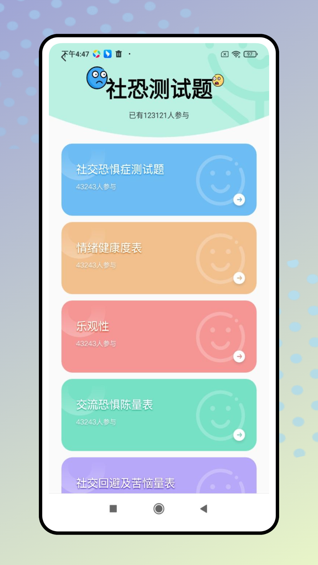 社恐聚集地,是为追求心灵宁静的您专属打造的空间。在这里,我们为您提供压力自测服务,还有社恐测试题,能让您深入地洞悉自己的情绪状态。情绪健康表与乐观性评估,有助于您把握自己内心的动态。此外,我们还有交流恐惧陈亮表,它可以协助您找到社交恐惧的根源所在。心情之书则为您提供了记录情感历程的地方。在工具页面,包含了记忆训练、数字记忆、随机词汇等内容,这些都能够帮助您提升记忆力。我们全心全意陪伴您,助力您摆脱社恐的阴影,去拥抱更加美好的自己。