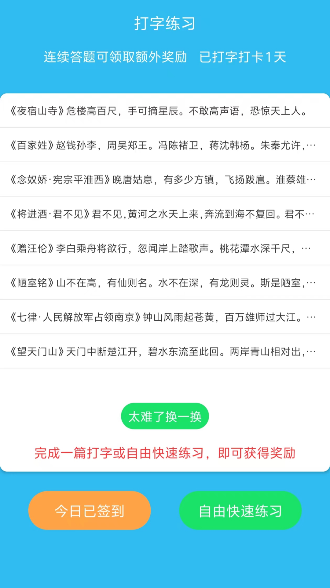 这是一款能够在线打字赚钱的软件哦。它每天都会更新古诗文内容,您既可以对照着这些古诗文进行打字操作,只要完成就能获取相应的奖励呢。在打字过程中,您还能顺便学习古诗文知识,一举两得。当然啦,您也可以自由发挥来打字,这能够让您的双手变得更加灵活敏捷,从而提高打字速度,轻松赚钱。