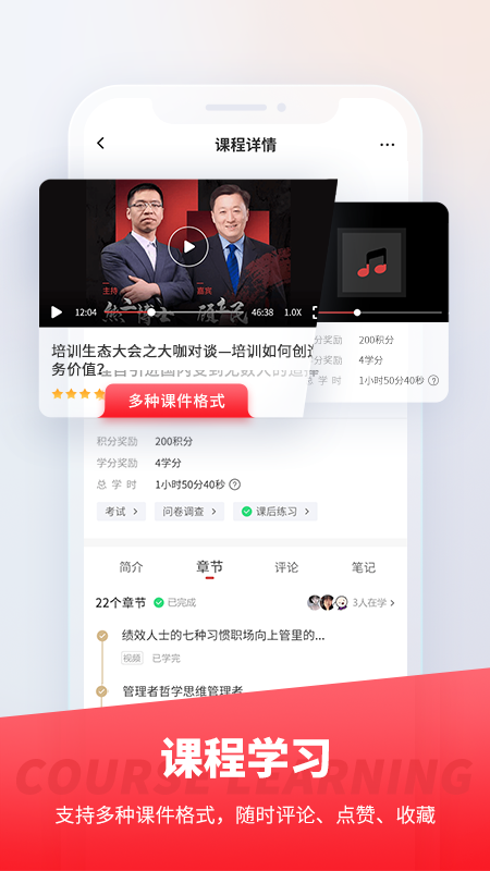 - 在课程格式方面,支持MP4、MP3、PPT、PPTX、doc、docx、pdf、H5、第三方链接等多种视频和文档格式。