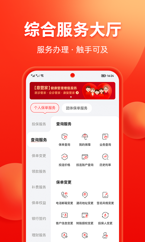 【掌上中意】APP是中意人寿秉持以客户需求为核心的理念,依托数字化技术自主打造的一个集营销、服务、沟通于一体的数字保险平台。该平台致力于为客户提供多样化的功能与服务,涵盖自助保险服务、健康管理服务以及积分权益兑换等。其特色功能包括: