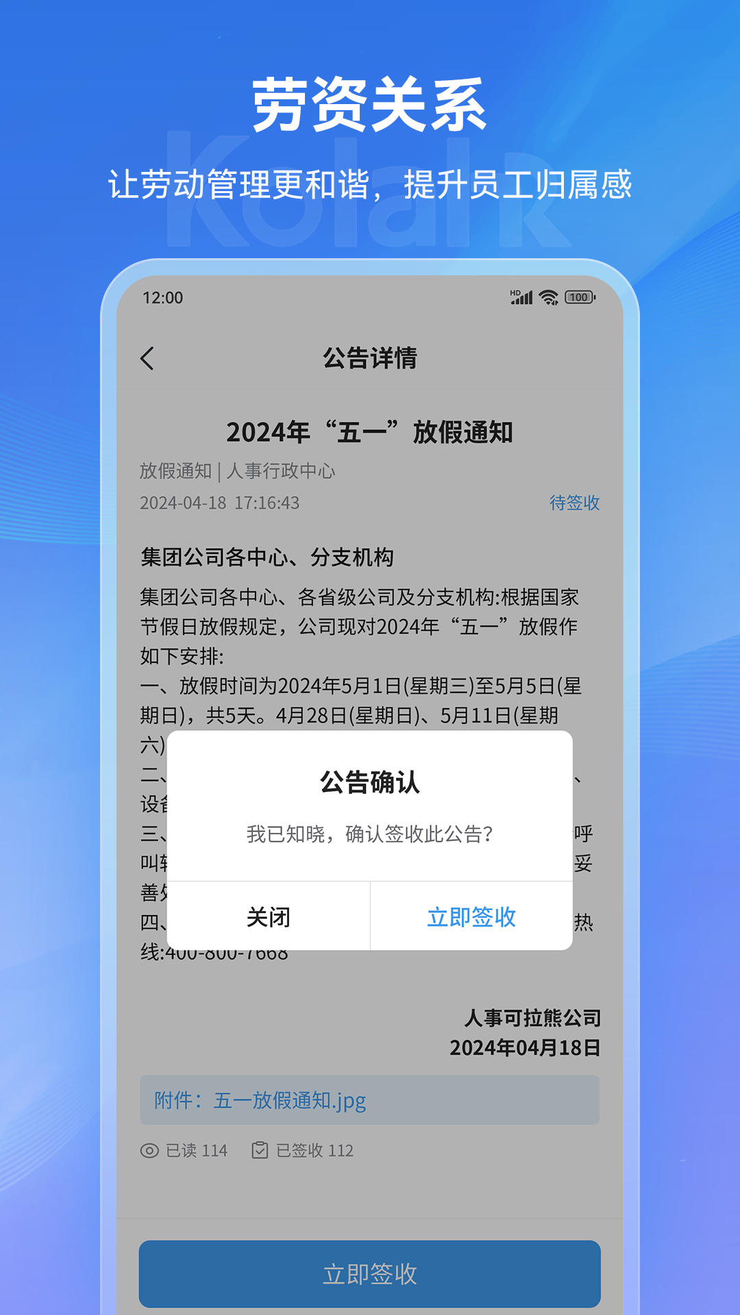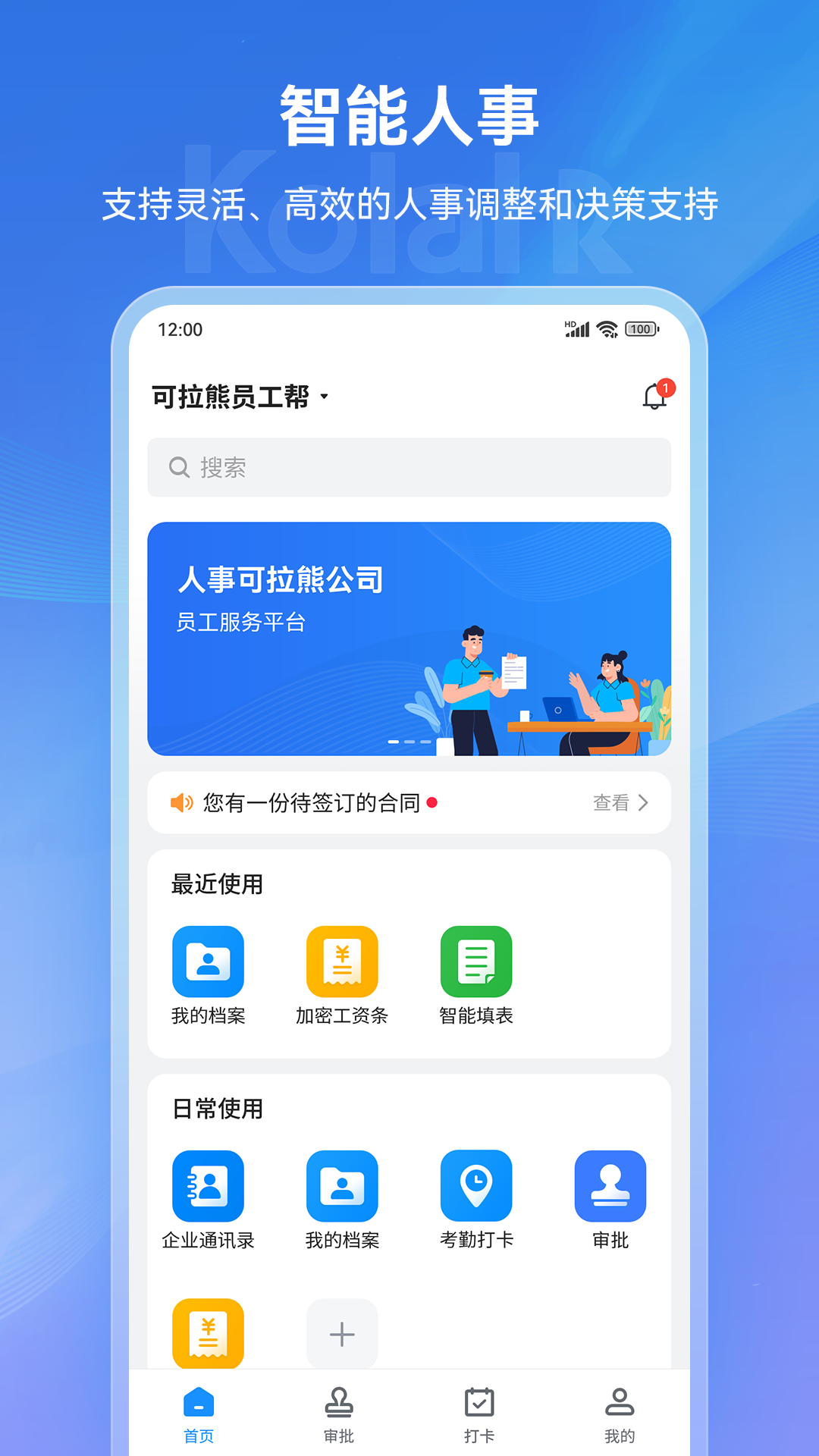 可拉熊员工帮凭借其全方位的功能体系、先进的云端服务以及集成的人工智能技术,不仅成功推动了企业人力资源管理的数字化转型、标准化操作及智能化决策,还通过一系列在线员工服务平台(包括自助入职、考勤打卡、通讯录、加密工资条、我的档案、开具证明、我的合同、成长记录、OA审批、企业知识管理等),显著增强了员工的日常工作效率与满意度,从而有力促进了更为和谐的劳动关系构建——“让劳动关系更和谐”。