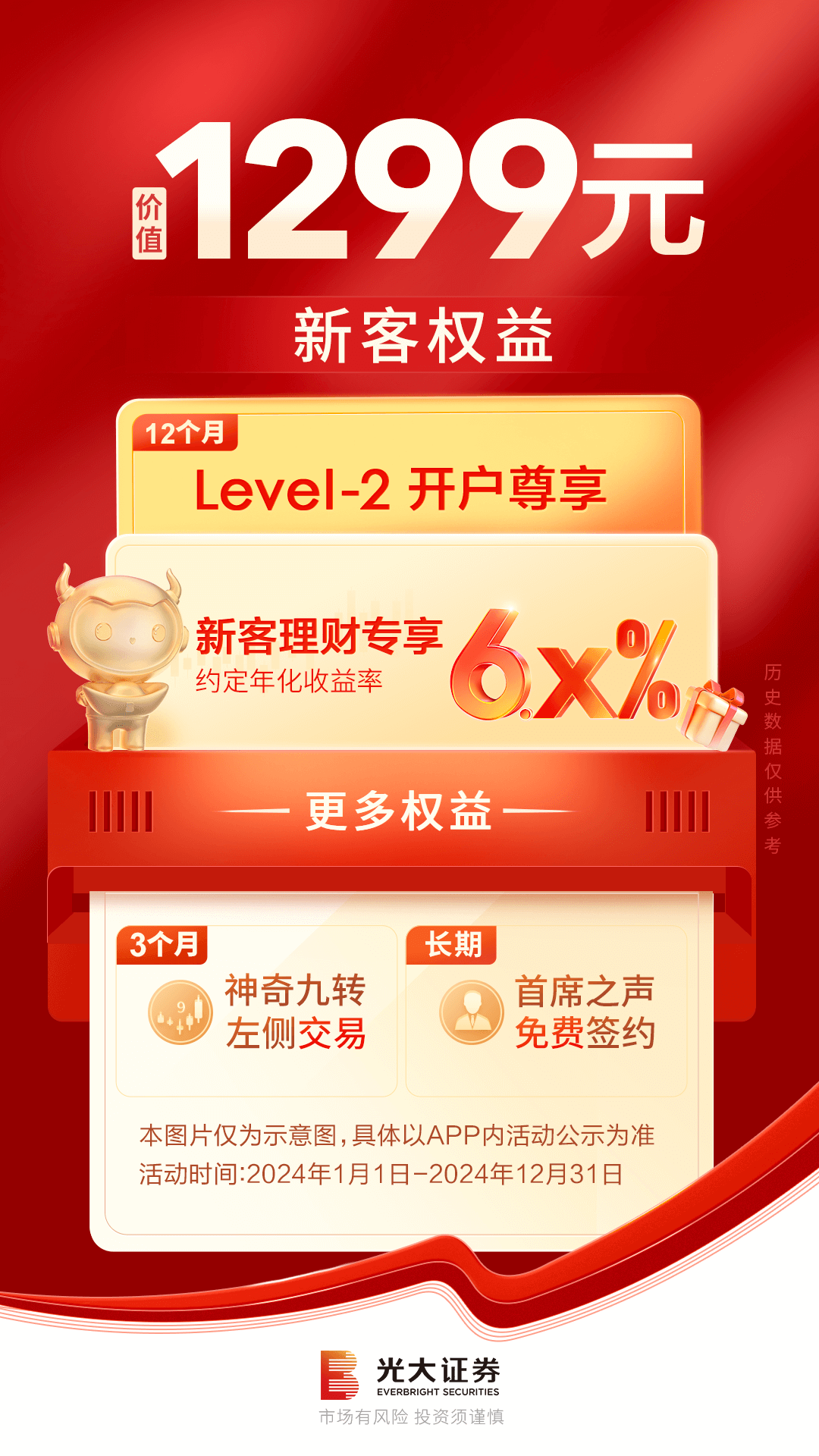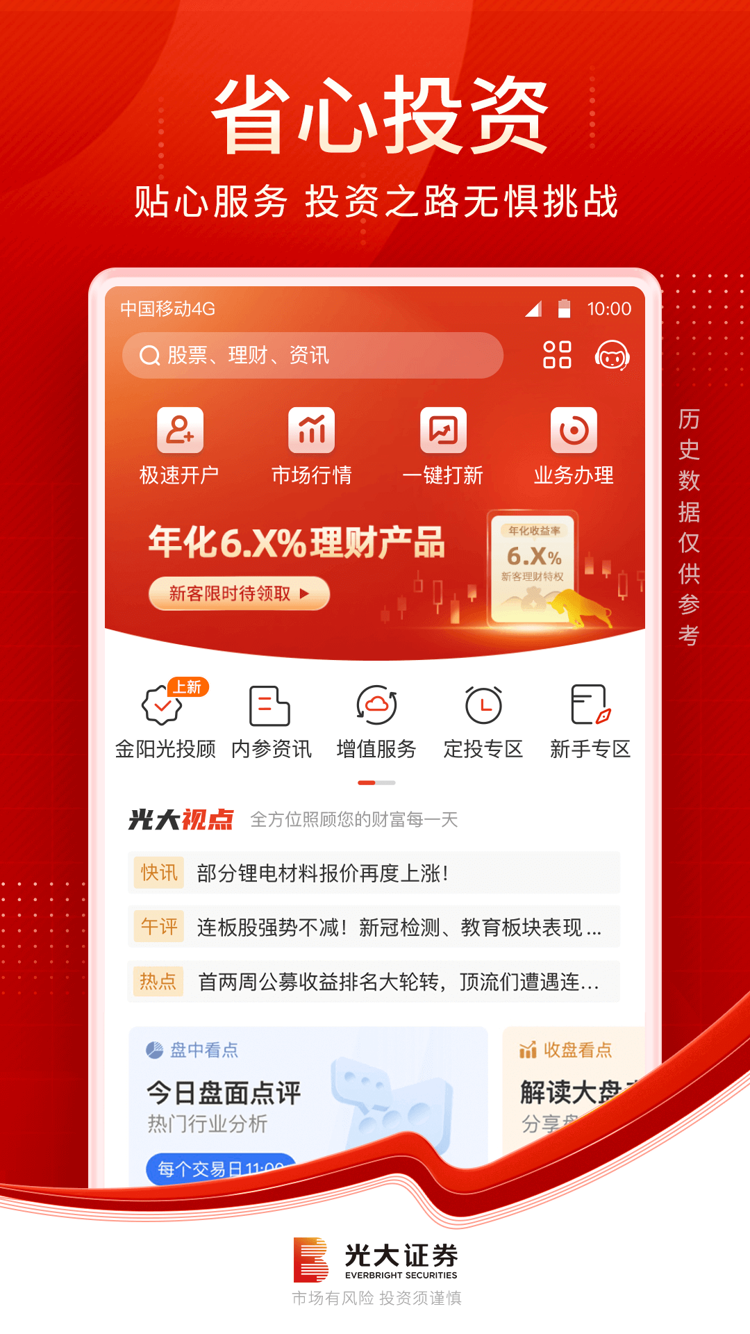 新客户通过光大证券金阳光APP开立证券账户,可体验年化收益率6.X%新客专享理财产品、12个月高端行情Level-2、3个月神奇九转决策工具等开户权益!