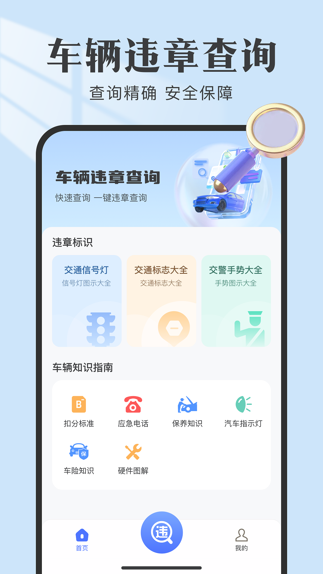 违章快查,您的行车安全小助手!集交通信号灯解析、交警手势教学、交通标志识别于一体,让出行更懂规则。内置扣分标准助您规避违章风险。应急电话一键直达,紧急情况不再慌张。指示灯详解,夜间行车更安全。车驾科普专区,涵盖车险知识普及与车辆保养小贴士,爱车养护轻松学。全方位守护您的驾驶之旅,让每一次出行都安心无忧!
