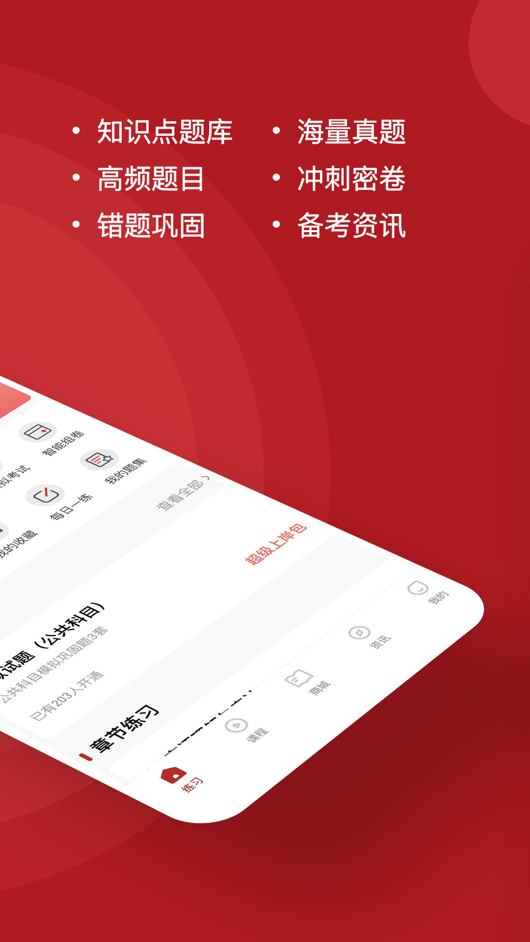 【章节练习】每个科目都有独立的章节题库,刷题轻松容易,为同学们节省大量复习时间。