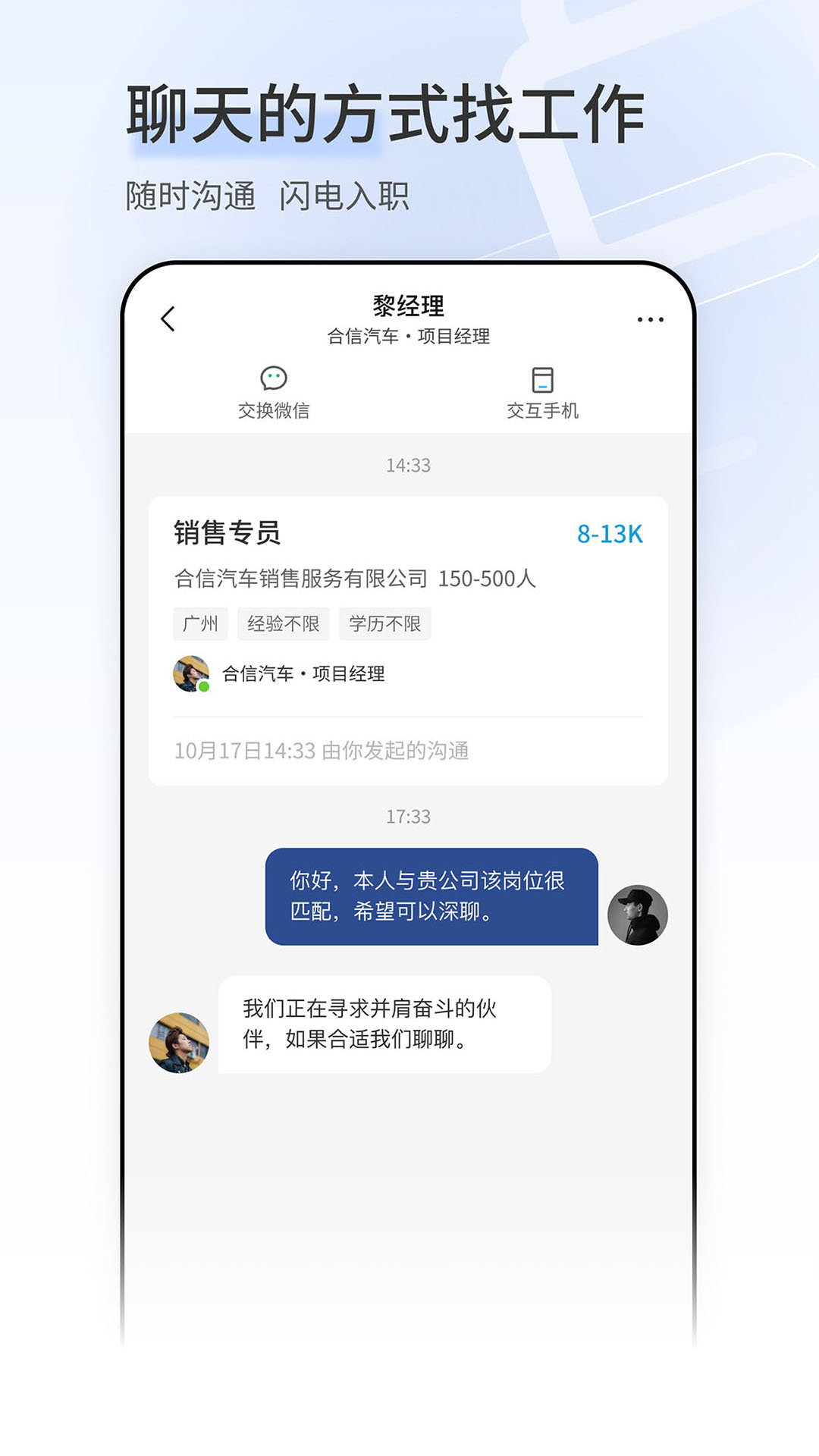 1. 它提供了一种类似微信App的求职方式,以聊天的形式找工作。求职者可以随时随地与招聘方进行约聊,双方能够当场达成就业意向,实现闪电入职。