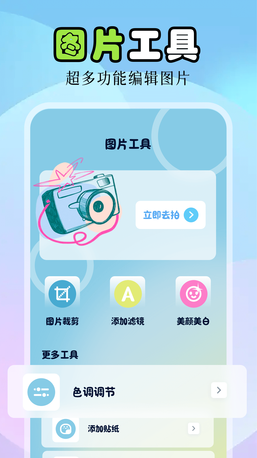 在图片处理方面,它具备强大的【图片工具】。其中包括图片裁剪功能,还能添加滤镜、进行美颜美白操作、调节色调等。并且,根据不同的场景,用户可以对图片进行编辑,添加贴纸、文字、涂鸦,调整色调等操作,进而达成自己理想中的最佳视觉效果。
